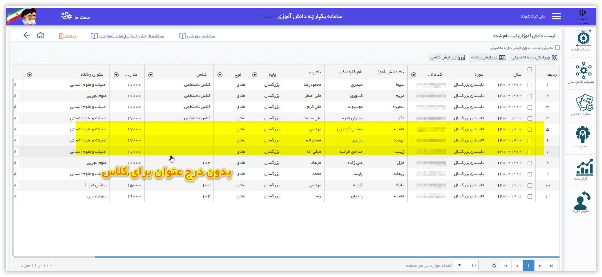 توجه 5) اگر در قسمت ثبت نام و نمایش انتخاب دروس دانش آموزانی وجود دارند که ذر بخش کلاس هیچ عنوانی (نامشخص / نام کلاس) درج نشده است تصویر زیر