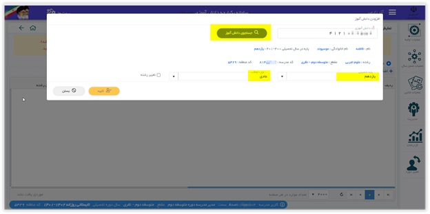 هفت) در این صفحه با کلیک کردن بر روی اضافه کردن دانش آموزان خارج از مدرسه / وقفه، ابتدا کد ملی دانش آموز را وارد و بر روی جستجوی دانش آموز کلیک نمایید.