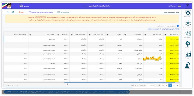 نکته: در مدارس بزرگسال اسامی دانش آموزان در قسمت ثبت نام میان پایه، بخش در حال بررسی وجود دارند بنابر این می توانید از همین قسمت کد ملی آن ها را کپی نمایید.