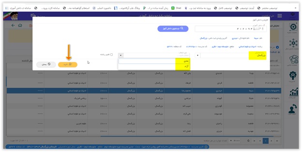 پس از مشاهده اطلاعات دانش آموز ابتدا پایه و سپس در قسمت نوع داوطلب گزینه مناسب را انتخاب نمایید. در نهایت عنوان تایید را لمس کنید تا دانش آموز ثبت نام شود.