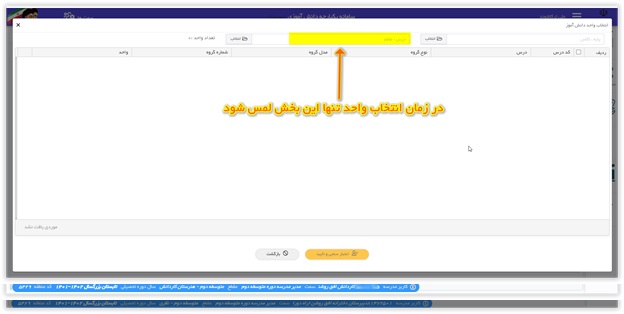نکته هشتم)) در نظر داشته باشد که در زمان انتخاب واحد با انتخاب بخش پایه-کلاس و بعد درس-معلم، تنها درس هایی نشان داده می شوند که برای آن پایه-کلاس تعریف شده اند نه دروس دیگر.