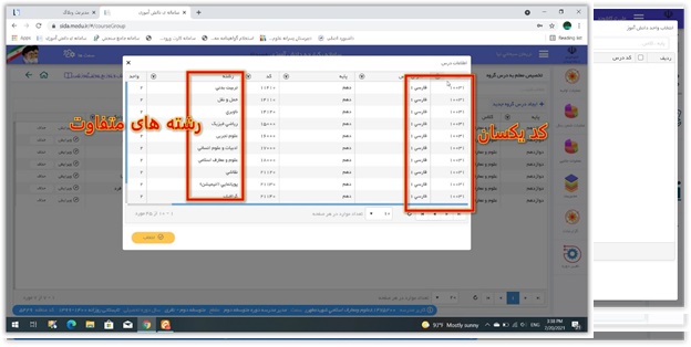 نکته سوم)) اگر در هنگام تخصیص معلم به درس دقت کرده باشید سامانه دروس مشترک رشته ها را به صورت مجزا برای هر رشته در سامانه نشان می دهد. لذا در این خصوص وسواس بیش از حد لازم نیست و فقط یک درس را انتخاب نمایید، در اینجا اولویت کد درس است نه رشته.