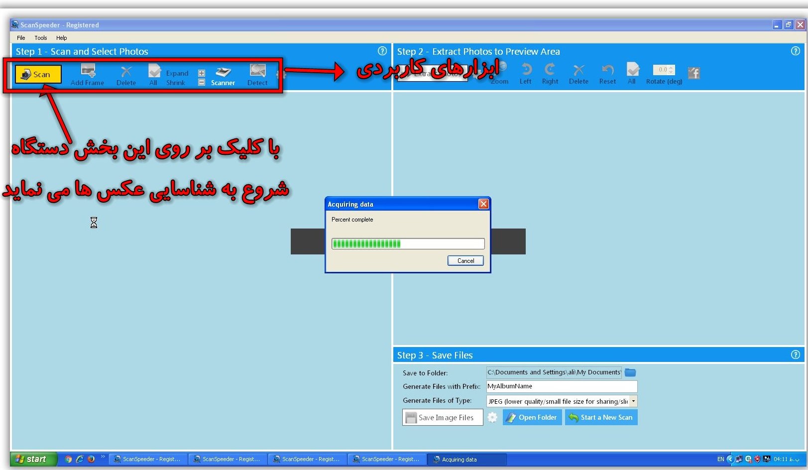 اسکن و تفکیک عکس برای انجام این کار شما می توانید از نرم افزارهای مختلفی استفاده نمایید. با یک جستجوی ساده در فضای مجازی می توانید از اسم و روش کار هر کدام مطلع شوید. در این جا بنا است تا با روش کار یکی از این نرم افزارها به (Scan Speader) آشنا شویم. ۱ ) ابتدا برنامه مورد نظر را دانلود نمایید. دانلود مستقیم (Scan Speeder) دانلود از بخش نرم افزارهای وبلاگ (http://torkashvandali.blogfa.com) ۲ ) پس از دریافت فایل setup را اجرا نموده و برنامه را نصب نمایید.