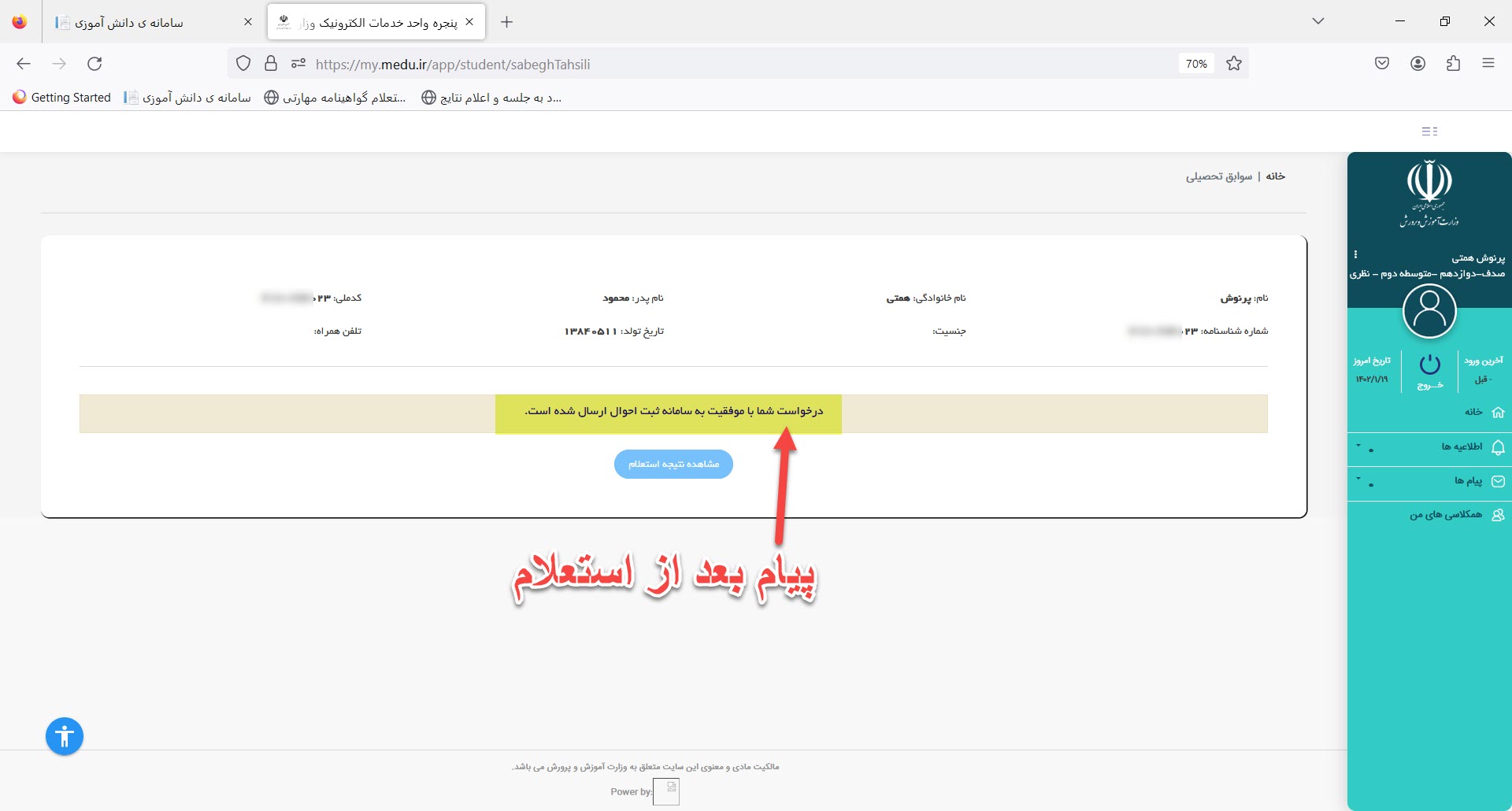 نهم: در این مرحله و صفحه نیاز به وارد کردن کد ملّی دانش آموز تاریخ تولد و همچنین کد امنیتی میباشد. پس از ثبت این اطلاعات بر روی عنوان استعلام کلیک مینماییم.