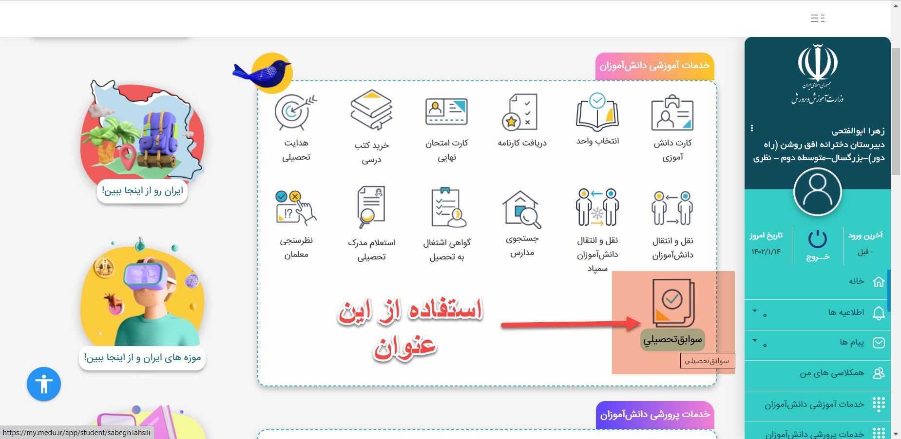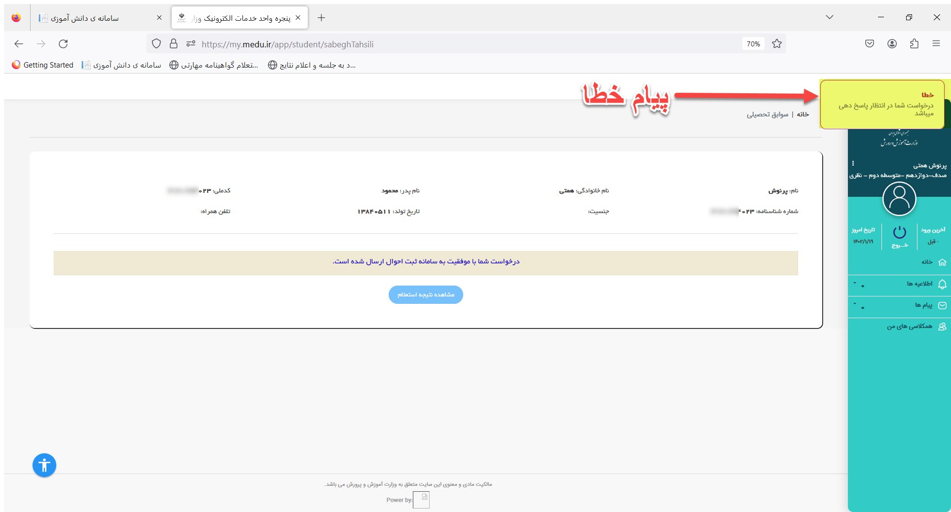 اطلاعیه شیوه دریافت کد سابقه تحصیلی و ثبت نام برای ایجاد سابقه تحصیلی و ترمیم نمره دانش آموزان برای مشاهده و بررسی سوابق نمرهای خود از تاریخ ۱۰ خرداد تا ۱۰ تیر ۱۴۰۲ مجدداً به درگاه خدمات وزارت آموزش و پرورش به نشانی (https://my.medu.ir) مراجعه و مطابق با راهنمایی که متعاقباً در سامانه اطلاعرسانی میشود، اقدام نمایند. برای مشاهده و بررسی نمراتی که در آزمونهای نهایی خرداد ۱۴۰۲ کسب میشود از تاریخ پنجم تا دهم تیر ۱۴۰۲ در درگاه مذکور اقدام شود. نکته: کلیه دانش آموزانی که قبلا (در هر نظامی) فارغ التحصیل شده اند برای گرفتن کد سوابق تحصیلی می توانند از درگاه دولت به آدرس https://sso.my.gov.ir/login وارد شوند. ---------------------------------------------------------------------------------------------