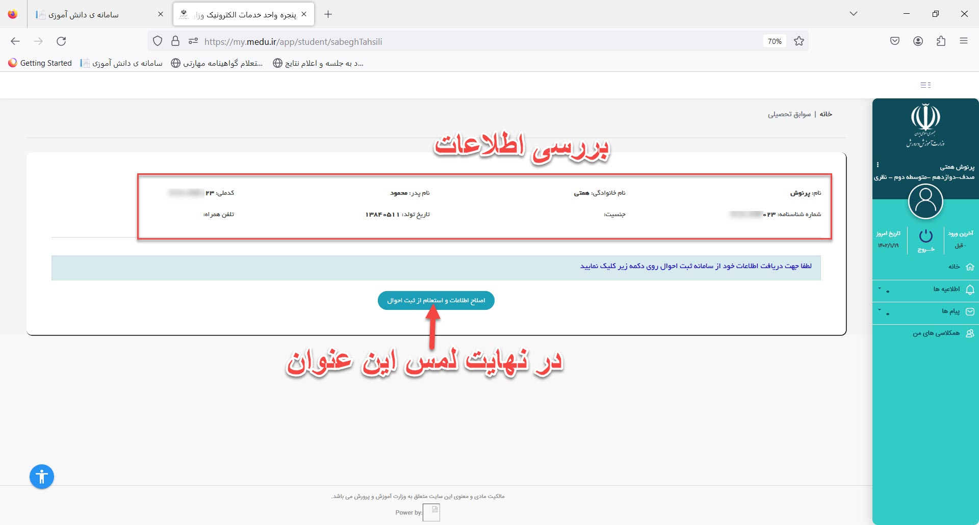 ۵. با لمس عنوان سوابق تحصیلی شما به صفحه مربوط به مشخصات فردی دانش آموز ارجاع داده می شوید. در این صفحه دانش آموز باید مشخصات فردی خود را با توجه به اطلاعات شناسنامه بررسی نماید در صورت در صورت صحت و یا عدم اطلاعات، عنوان اصلاح اطلاعات و استعلام از ثبت احوال را کلیک می نماید.