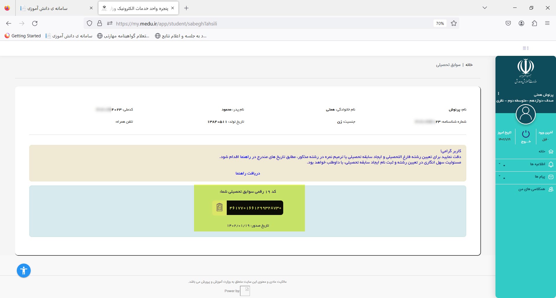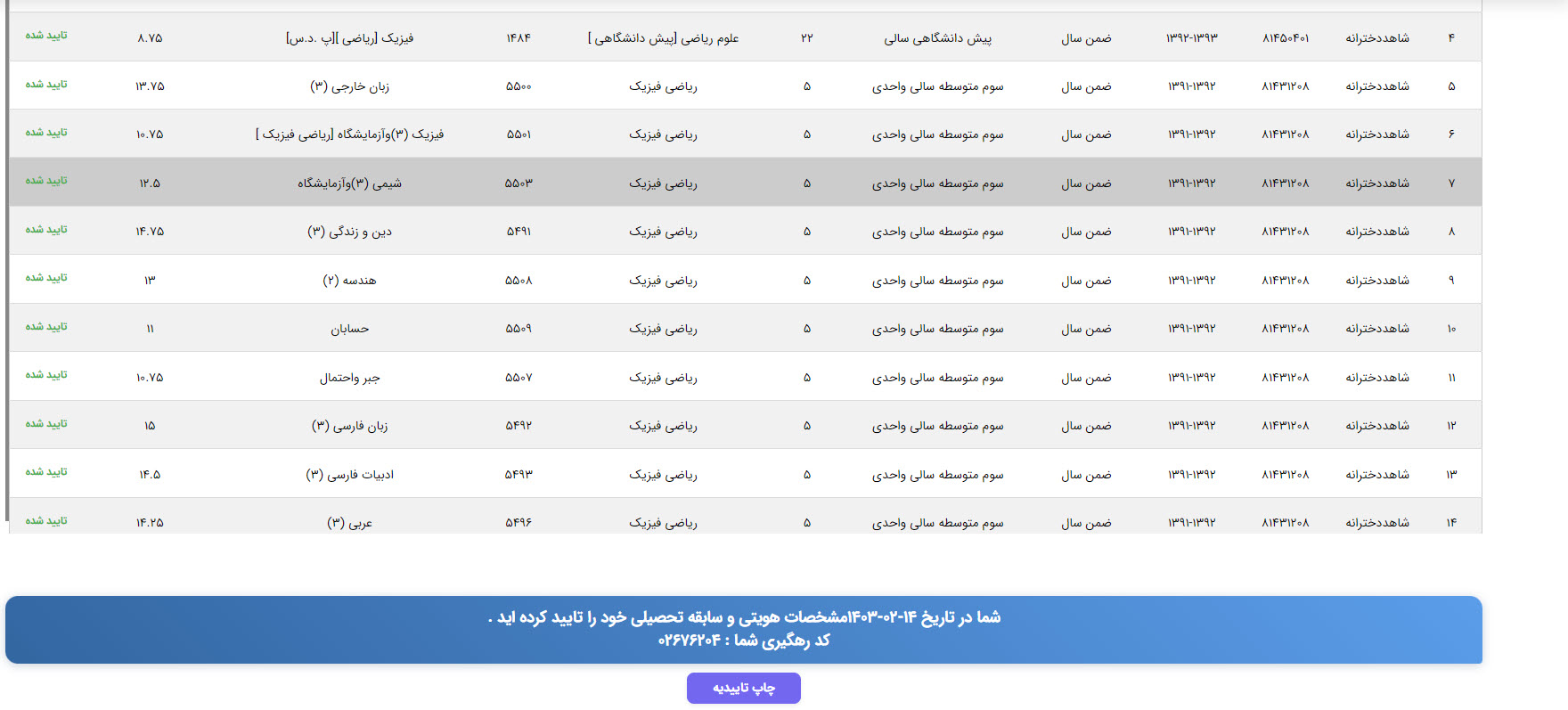 قابل ذکر اینکه علاوه بر تایید اطلاعات کد رهگیری نیز ایجاد میگردد. علاوه بر اینکه این کد به شماره همراه ارسال میشود این کد در سامانه نیز وجود دارد که میتوانید نسبت به چاپ تاییدیه تحصیلی نیز اقدام نمایید.