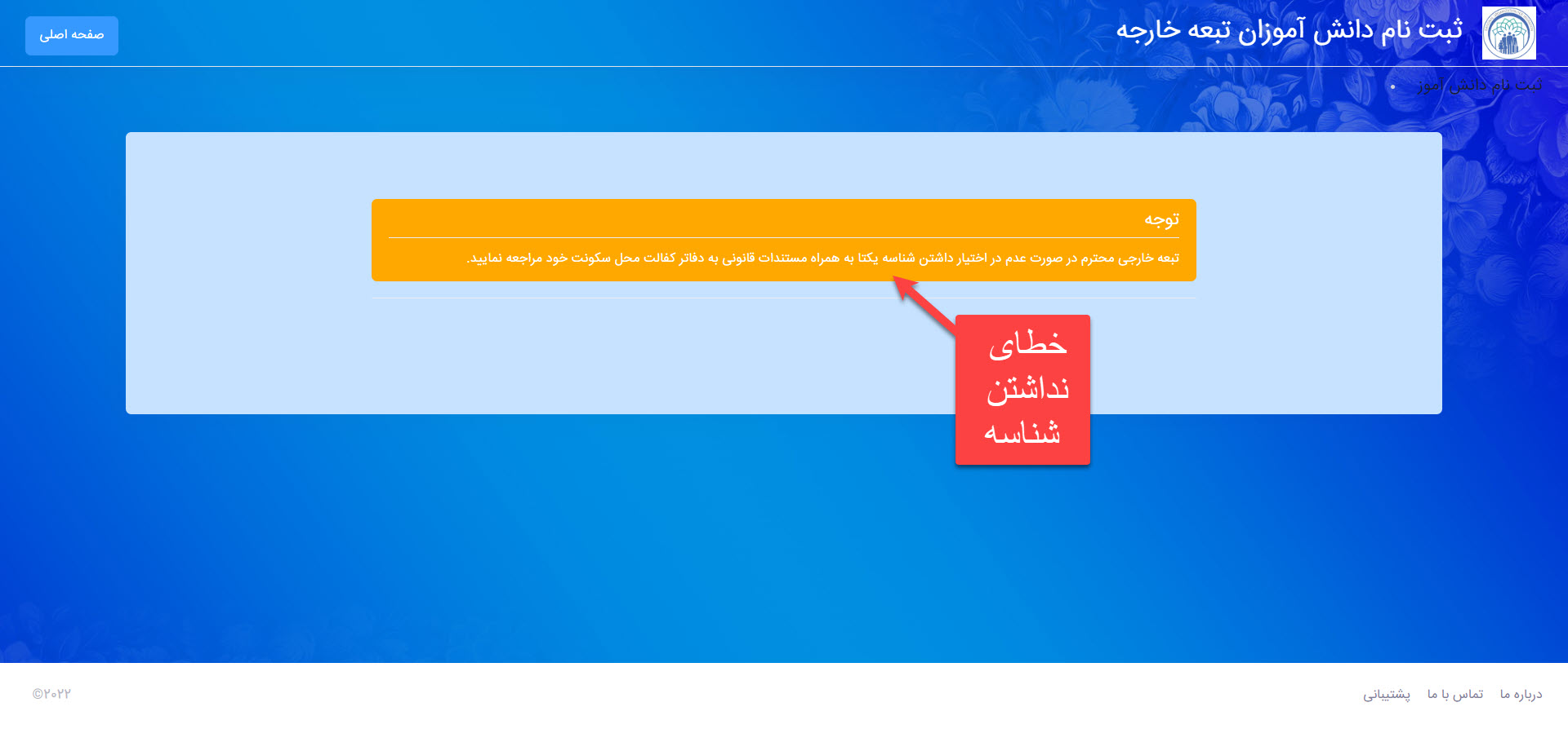 ۳. در این صفحه بخشهایی که تعبیه شده است که باید تکمیل شوند. الف نوع شناسه: در این قسمت عنوانهای شناسه یکتا ۱۰ رقمی، کد شناسایی تبعه، کد اختصاصی فیدا، شناسه فراگیر ناجا و شماره پاسپورت وجود دارد. ب: بخش تاریخ تولد که تاریخ تولد دانش آموز تبعه باید ثبت شود. ج: شماره شناسه؛ شمارهای است که اتباع از دفتر کفالتی دریافت مینمایند. اگر شماره شناسه اشتباه باشد با خطای زیر مواجه میشوند