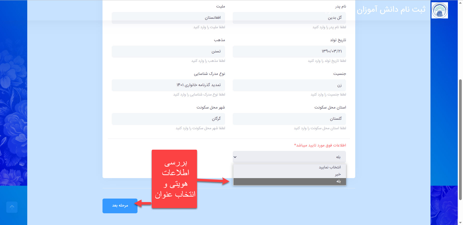 ۴. پس از تکمیل فرایند و درج اطلاعات خواسته شده در سامانه فوق وارد صفحه اطلاعاتی دانش آموز میشوند در این قسمت دانش آموز اطلاعات هویتی خود را بررسی کرده و اگر اطلاعات مورد تایید میباشد، در آخرین قسمت گزینه بله را انتخاب و عنوان مرحله بعد را لمس مینماید.