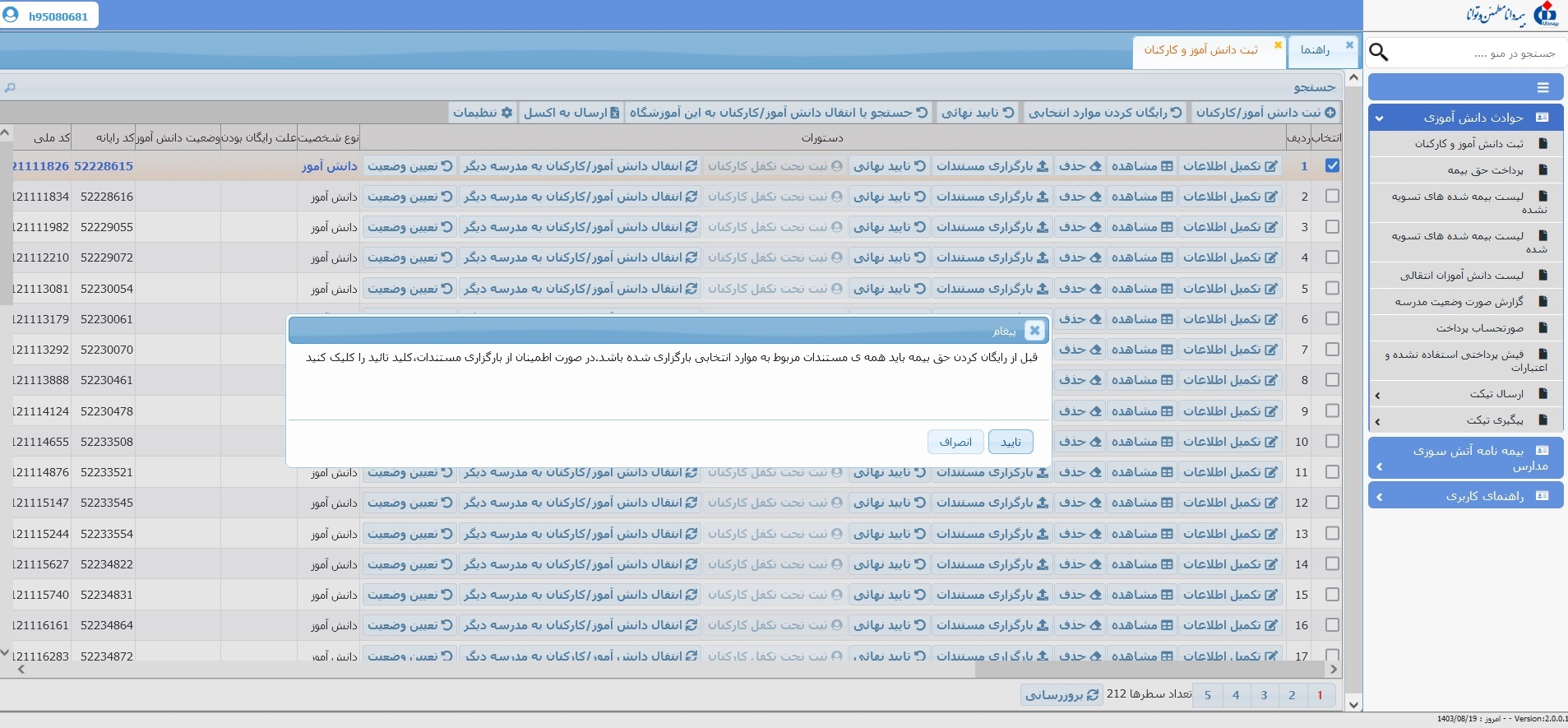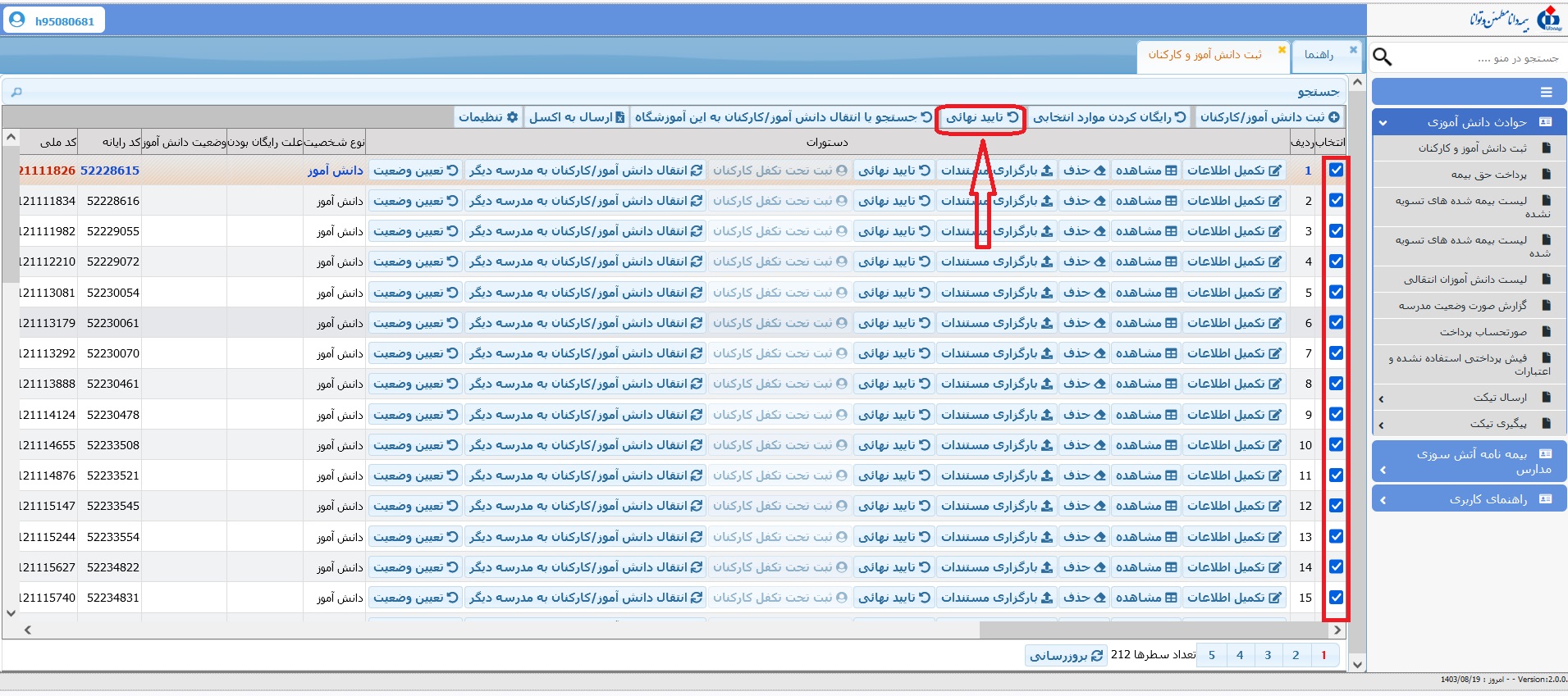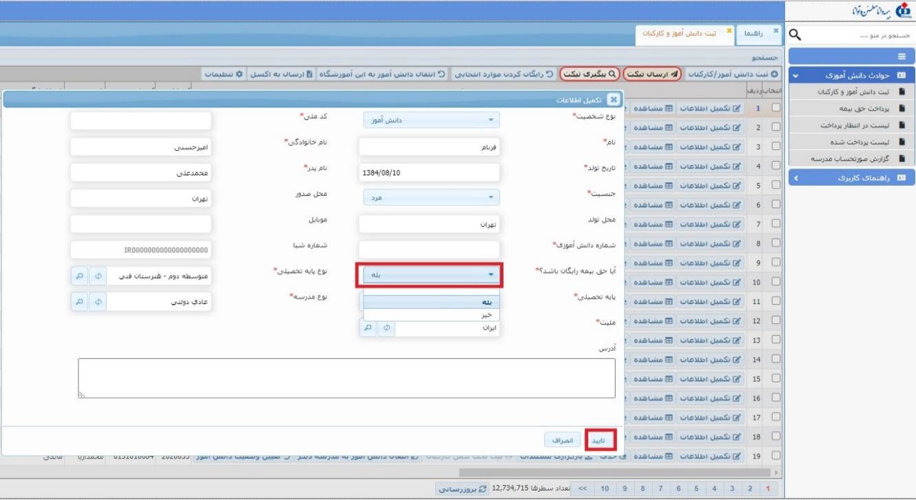 پس از تکمیل مراحل فوق و اطمینان از صحت اطلاعات در هر صفحه با انتخاب کلیه دانش آموزان عملیات تایید نهایی را برای آنان انجام می دهیم.این کار را برای کلیه دانش آموزان انجام می دهیم. در زمان تایید نهایی با پیامی مبنی بر اطمینان از انجام کار نمایش داده می شود، در این حالت عنوان تایید را لمس نمایید.