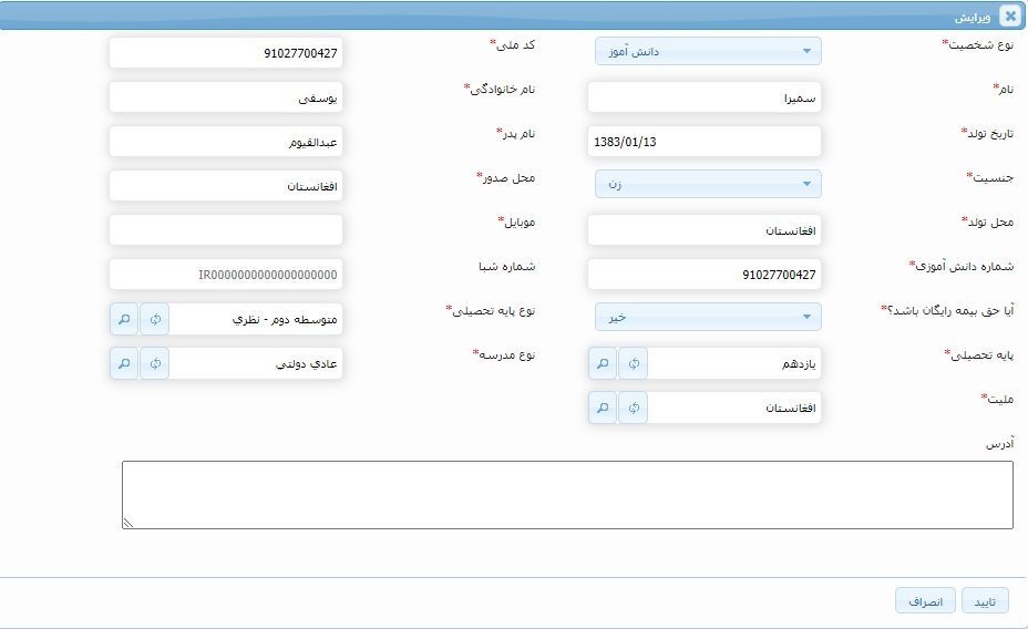 یازدهم: در مرحله بعد تمام اطلاعات مربوط به والدین و دانش آموز را به طور کامل بر اساس شناسنامه تکمیل میکنیم و وارد مرحله بعدی میشویم.