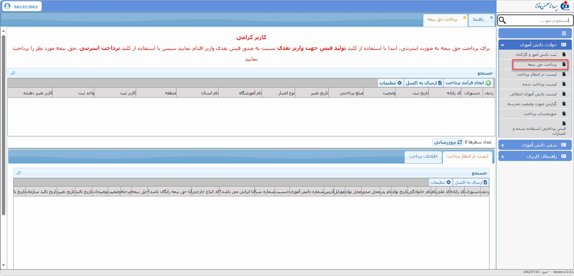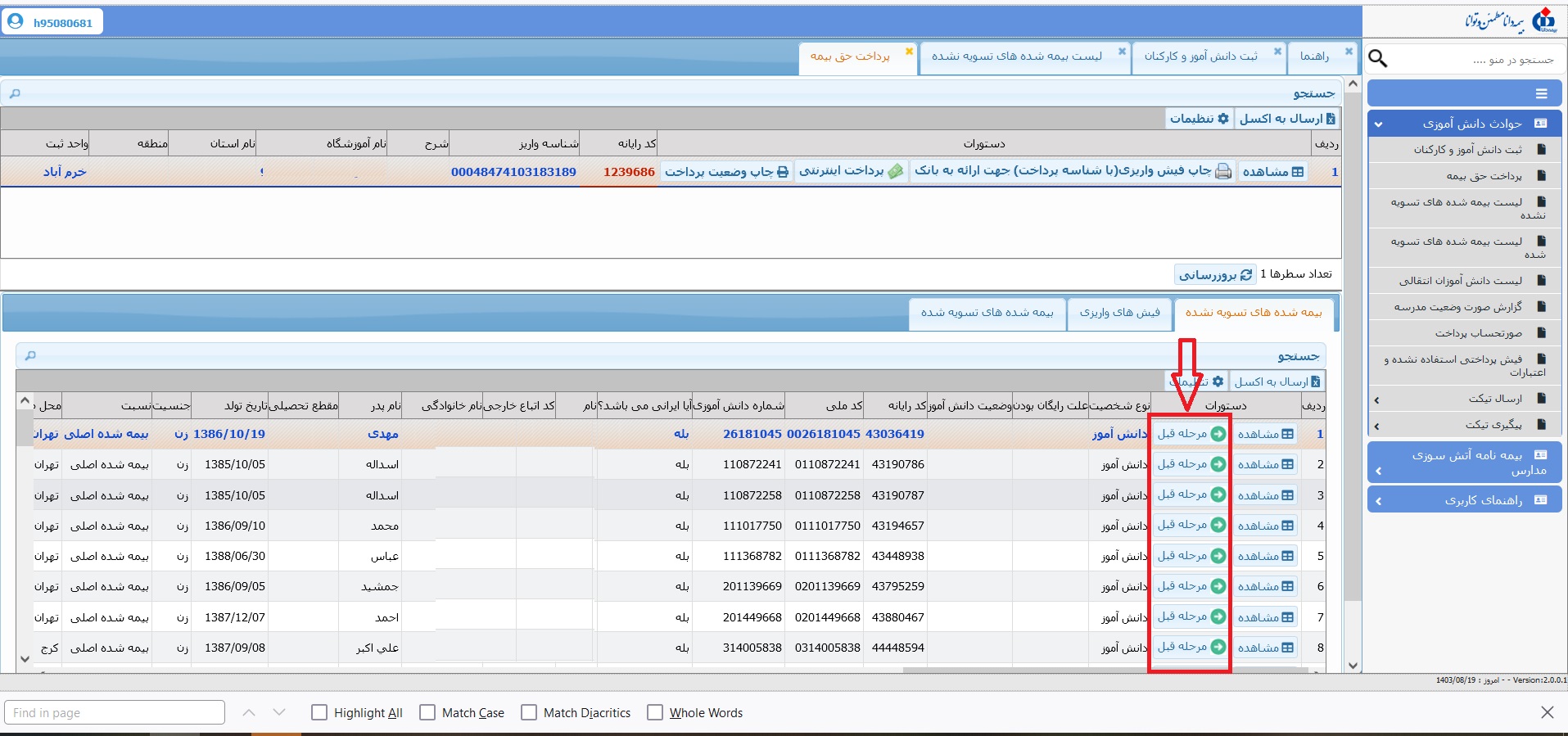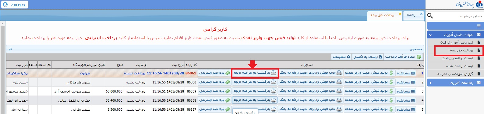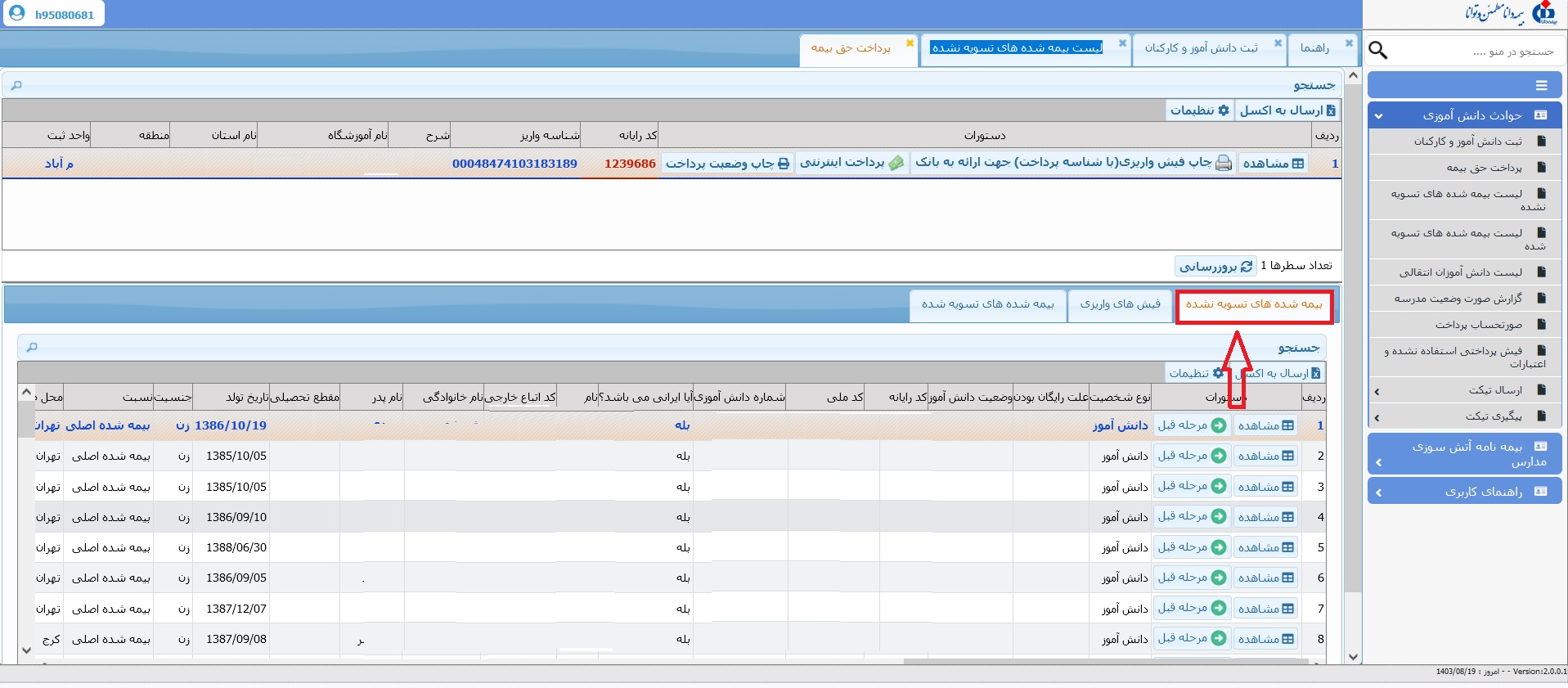 لیست در انتظار پرداختاز طریق این منو تمامی دانش آموزان و کارکنانی که در قسمت قبلی برای پرداخت حق بیمه انتخاب شده اند نمایش داده خواهد شد.