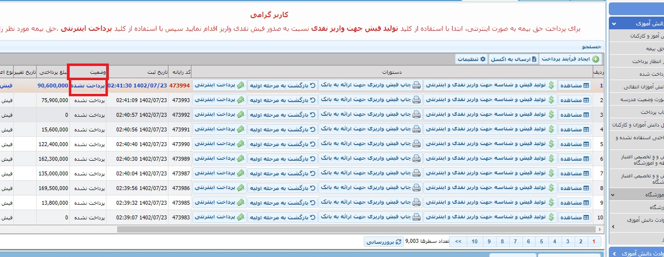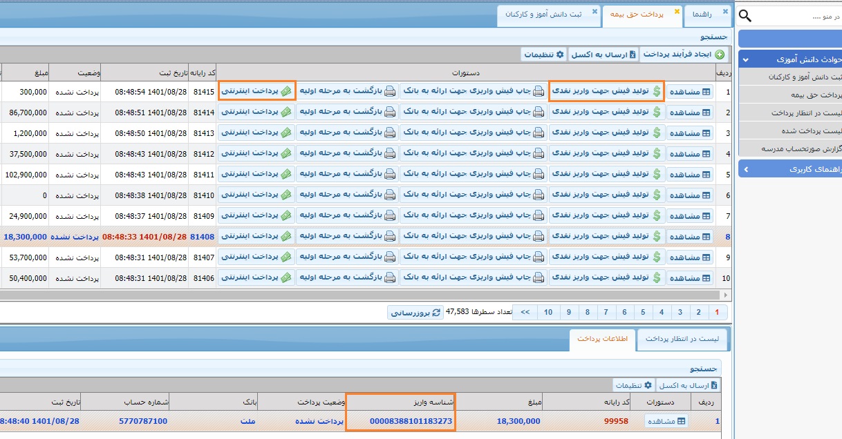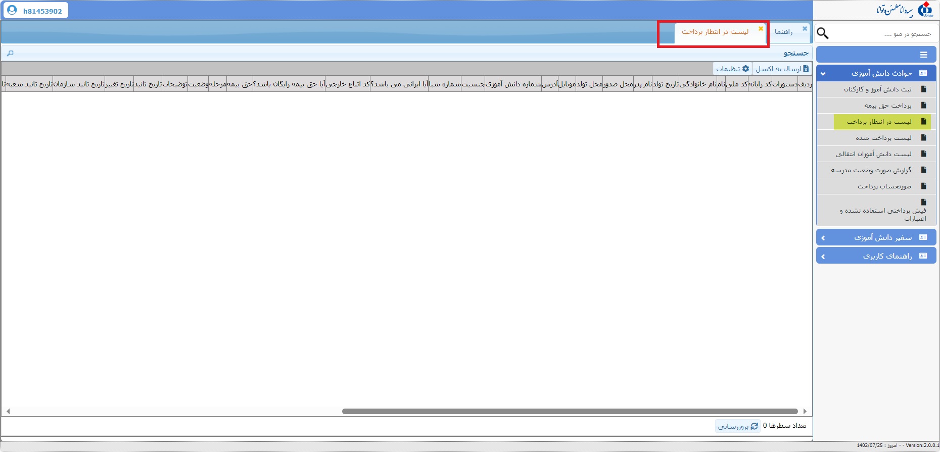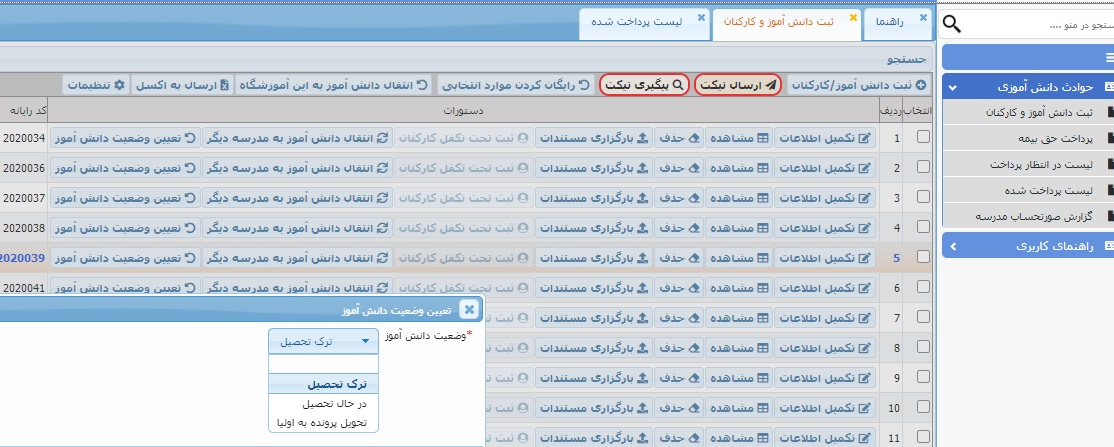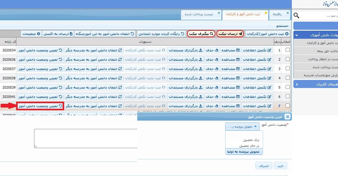 لیست در انتظار پرداختاز طریق این منو تمامی دانش آموزان و کارکنانی که در قسمت قبلی برای پرداخت حق بیمه انتخاب شده اند نمایش داده خواهد شد.