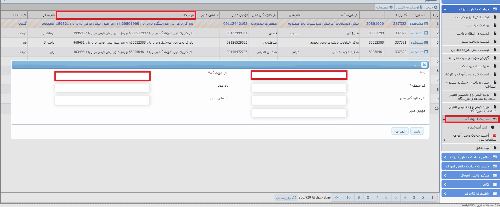نکته : در خصوص مدارس و مهد کودک های تحت نظارت وزارت آموزش و پرورش که در سامانه تعریف نشده اند کاربر مناطق و یا استان و همچنین کارشناسان شعب بیمه دانا می توانند آموزشگاه مورد نظر را با استفاده از گزینه مدیریت آموزشگاه و ثبت آموزشگاه، در سامانه ایجاد نمایند . نکته : با ثبت آموزشگاه جدید کد کاربری و رمز عبور در قسمت توضیحات نمایش داده می شود .