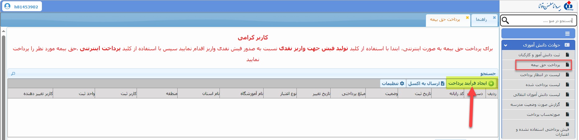 برای ایجاد فرایند پرداخت، برای دانش آموزان و کارکنانی که حق بیمه ی آنها پرداخت نشده، کلید ایجاد فرآیند پرداخت را کلیک کنید: