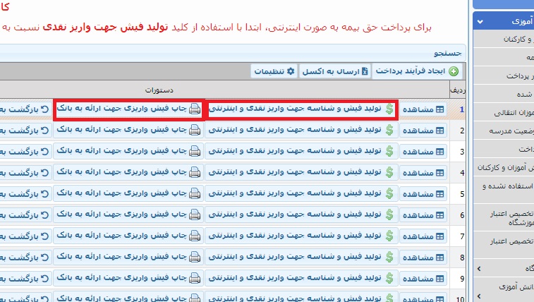2 - برای پرداخت مبلغ مورد نظر از طریق مراجعه با بانک ابتدا عنوان "چاپ فیش واریزی(با شناسه پرداخت) جهت ارائه به بانک"، را لمس نمایید و گزارش مربوطه را چاپ کنید. با چاپ فیش واریزی جهت ارائه به بانک ، شما قادر به پرداخت هزینه در تمامی شعب بانک ملت در سراسر کشور می باشید. نکته 1: با گذشت 72 ساعت کاری پس از پرداخت حق بیمه به صورت اینترنتی یا بانکی ، حق بیمه پرداختی در سامانه وصول و وضعیت فیش تولیدی به پرداخت شده تغییر می یابد . 12- بعد از پرداخت و تایید اسامی کلیه دانش آموزان از بخش تسویه نشده به بخش بیمه شده های تسویه شده منتقل خواهند شد. 13- در قسمت فیش های واریزی می توانید گزارش های پرداختی را مشاهده نمایید. 14- عنوان های دیگری نیز وجود دارن که می توانید اطلاعات دیگری را بدست آورید. برچسبها: غیر رایگان, رایگان, پرداخت حق بیمه نوشته شده در تاريخ پنجشنبه ۱۷ آبان ۱۴۰۳