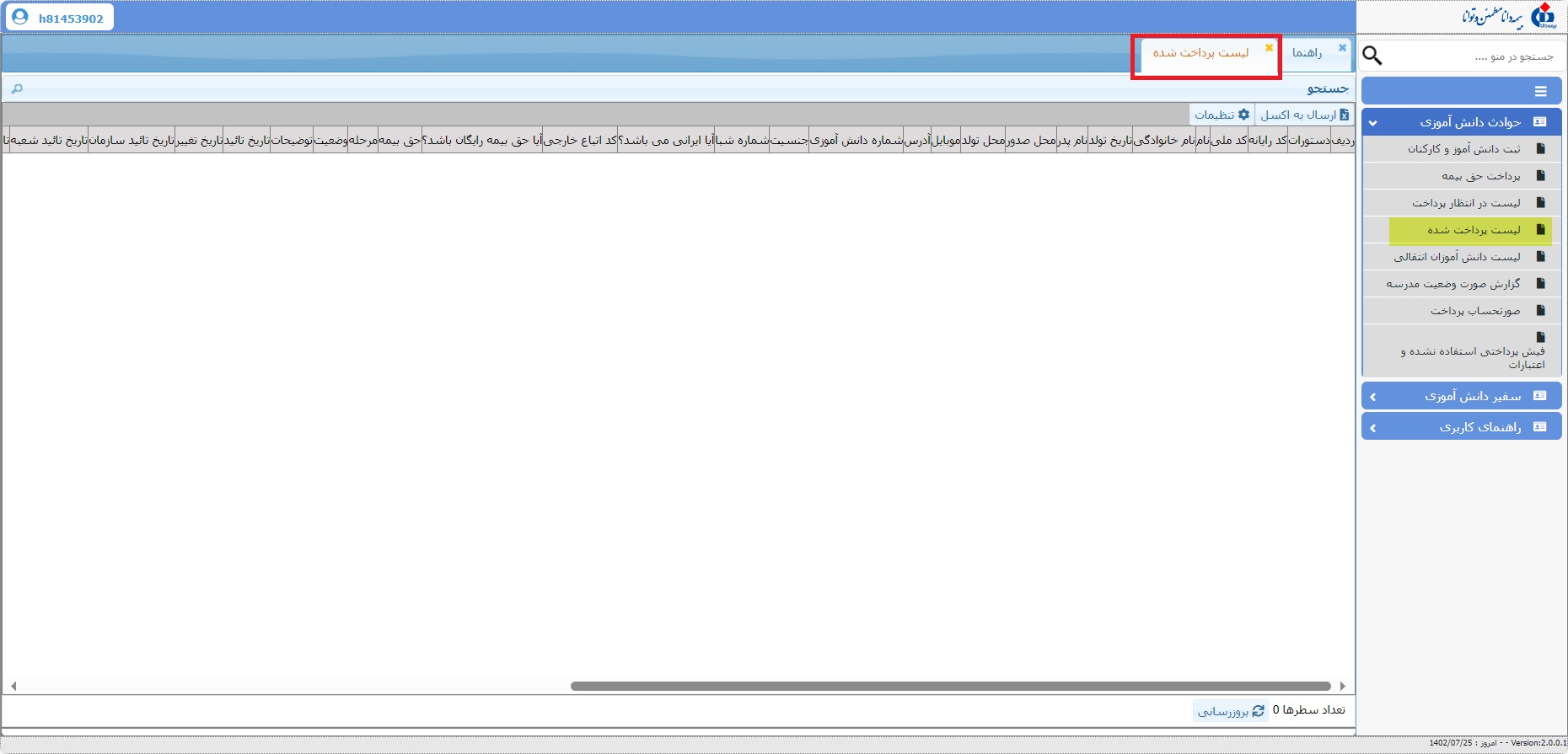 منوی لیست پرداخت شده پس از پرداخت حق بیمه مربوطه و ارسال صورت حساب از طرف بانک ، تمامی بیمه شدگان از لیست در انتظار پرداخت به منوی لیست پرداخت شده منتقل می گردند . و از طریق این منو تمامی دانش آموزان و کارکنانی که حق بیمه آنان پرداخت شده باشد نمایش داده خواهد شد.