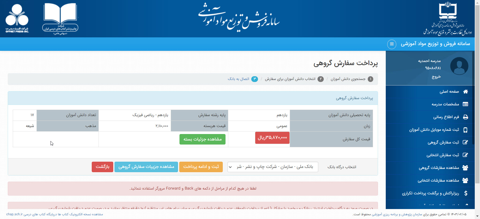 پس از ثبت سفارش صفحه مربوط به پرداخت سفارش گروهی برای شما فعال میگردد. در این صفحه توضیحات مربوط به سفارش مانند پایه، رشته، تعداد، قیمت هر بسته و قیمت کل سفارش وجود دارد.