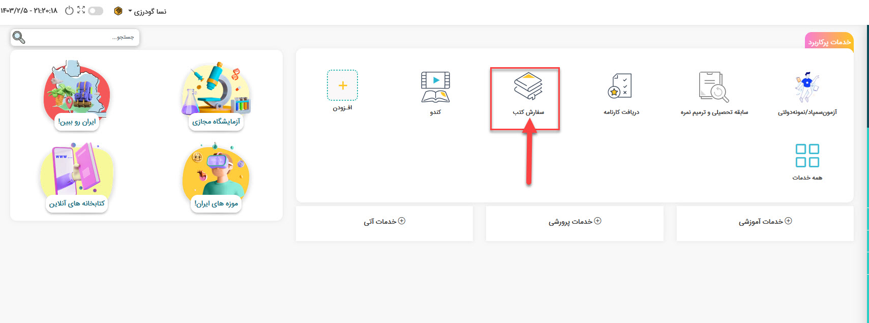 در کاربری دانش آموز نیست وانهای متفاوتی وجود دارند که میتوانند با استفاده از آنها نسبت به پیگیری سفارش خود اقدام نمایند از جمله مشاهده سفارش اصلاح سفارش محل دریافت کتاب و یا سایر موارد. روش سوم: برچسبها: ثبت سفارش کتب, سفارش گروهی, سفارش فردی نوشته شده در تاريخ پنجشنبه ۶ اردیبهشت ۱۴۰۳
