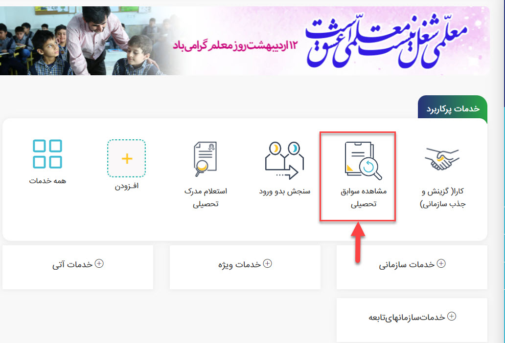 گروه اول: برای مشاهده سوابق تحصیلی خود از طریق سامانه مای به آدرس my.medu.ir وارد شده و عنوان مشاهده سوابق تحصیلی را انتخاب و فرایند را تکمیل مینمایند.