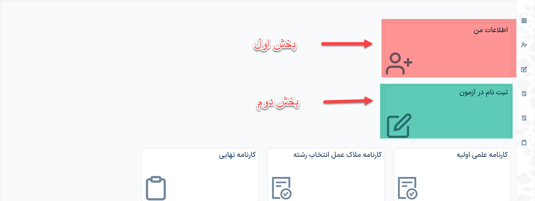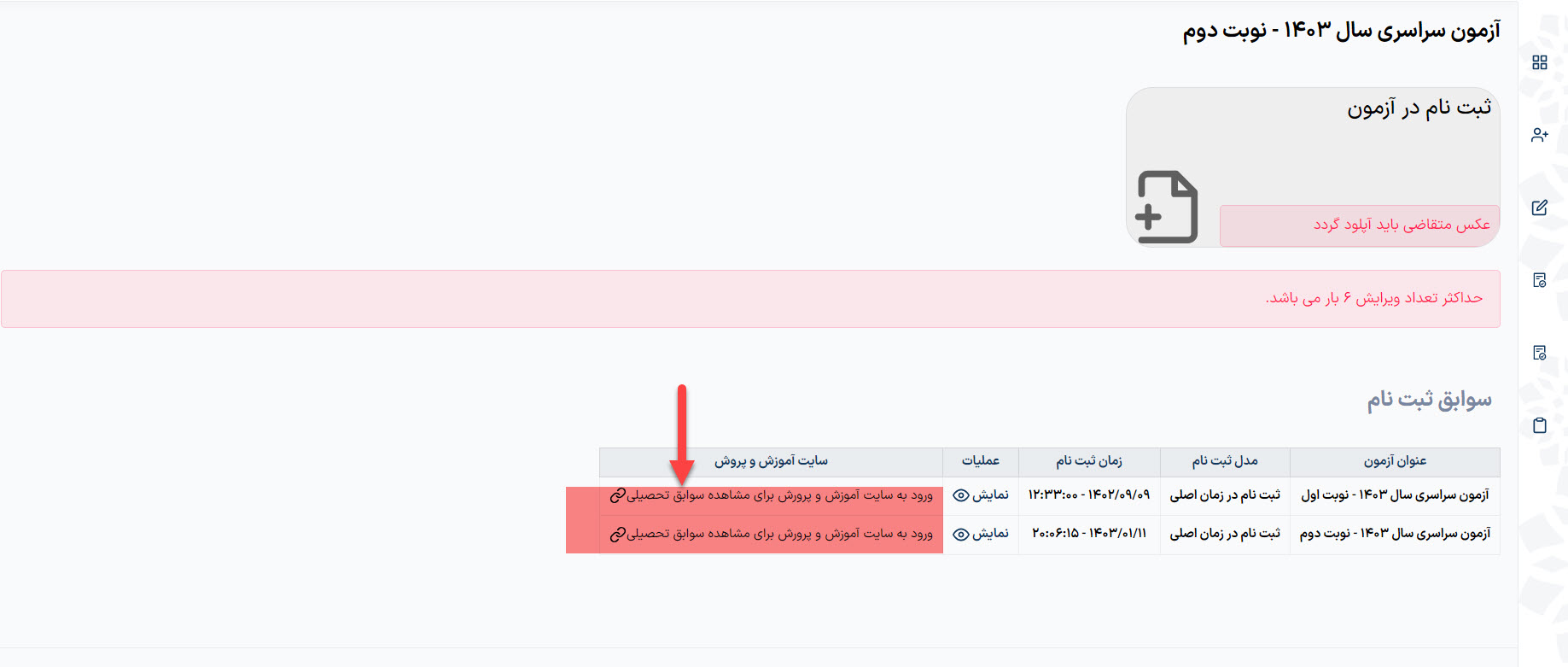 توجه: در کلیه بخشهای فوق بعد از ثبت اطلاعات میبایست فرایند تایید اطلاعات انجام گیرد. چهارم: حال به صفحه اولیه بازگشته و بر روی عنوان ثبت نام در آزمون کلیک مینمایید. در صفحه جدید عنوان آزمون سراسری را لمس می کنید تا وارد صفحه بعد شوید. پنجم: در این صفحه در بخش سوابق ثبت نام روی عنوان مورد نظر برای مشاهده سوابق تحصیلی کلیک نمایید.