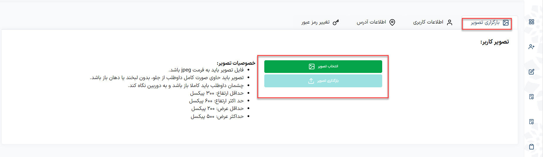 سوم: در این بخش سه عنوان بارگذاری تصویر؛ اطلاعات کاربری و اطلاعات آدرس وجود دارد. در بخش اول که مربوط به تصویر کاربر هست در صورت لزوم میتوانید عکس خود را تغییر داده و بارگذاری نمایید.