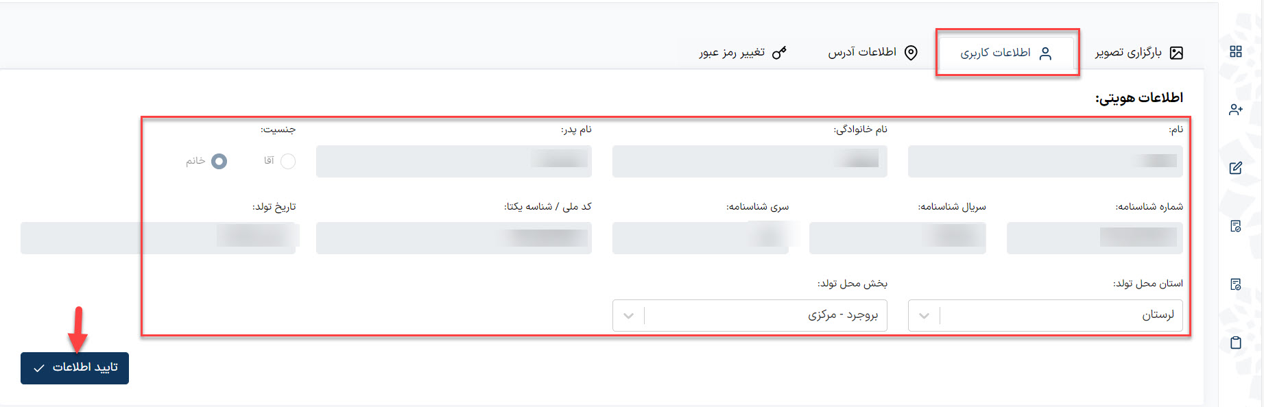 در بخش دوم اطلاعات هویتی (کاربری) قابل مشاهده هستند در صورت صحت اطلاعات عنوان تایید اطلاعات را لمس نمایید.