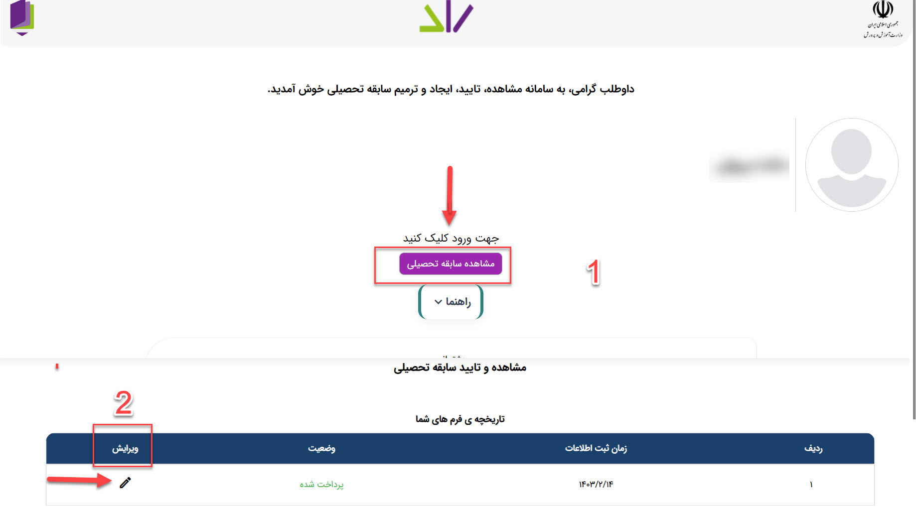 ششم: با لمس این عنوان شما به صفحه بعد ارجاع داده میشوید، در این صفحه نیز بر روی عنوان مشاهده سابقه تحصیلی کلیک کنید. در صفحه جدید نیز ابزار ویرایش را لمس نمایید.