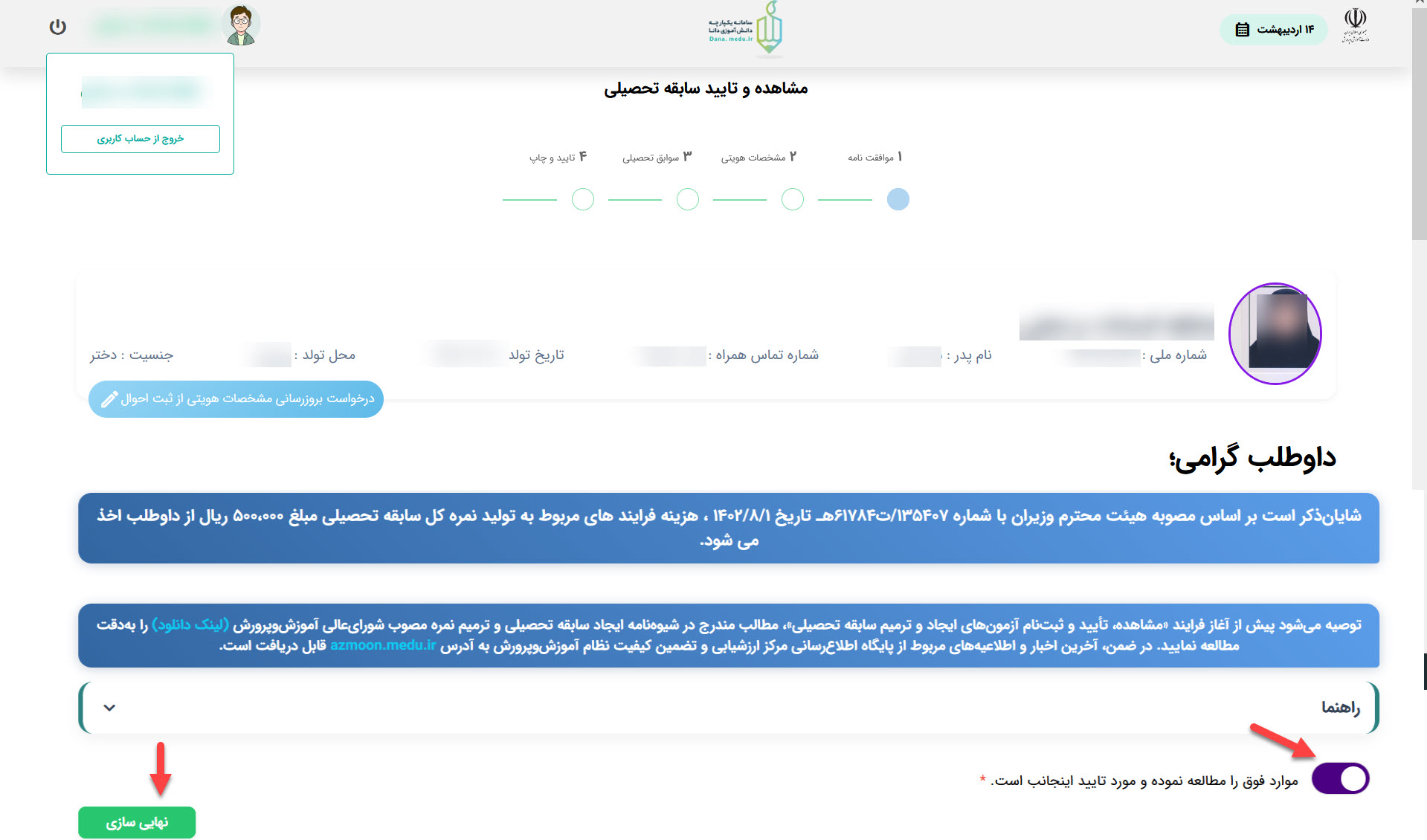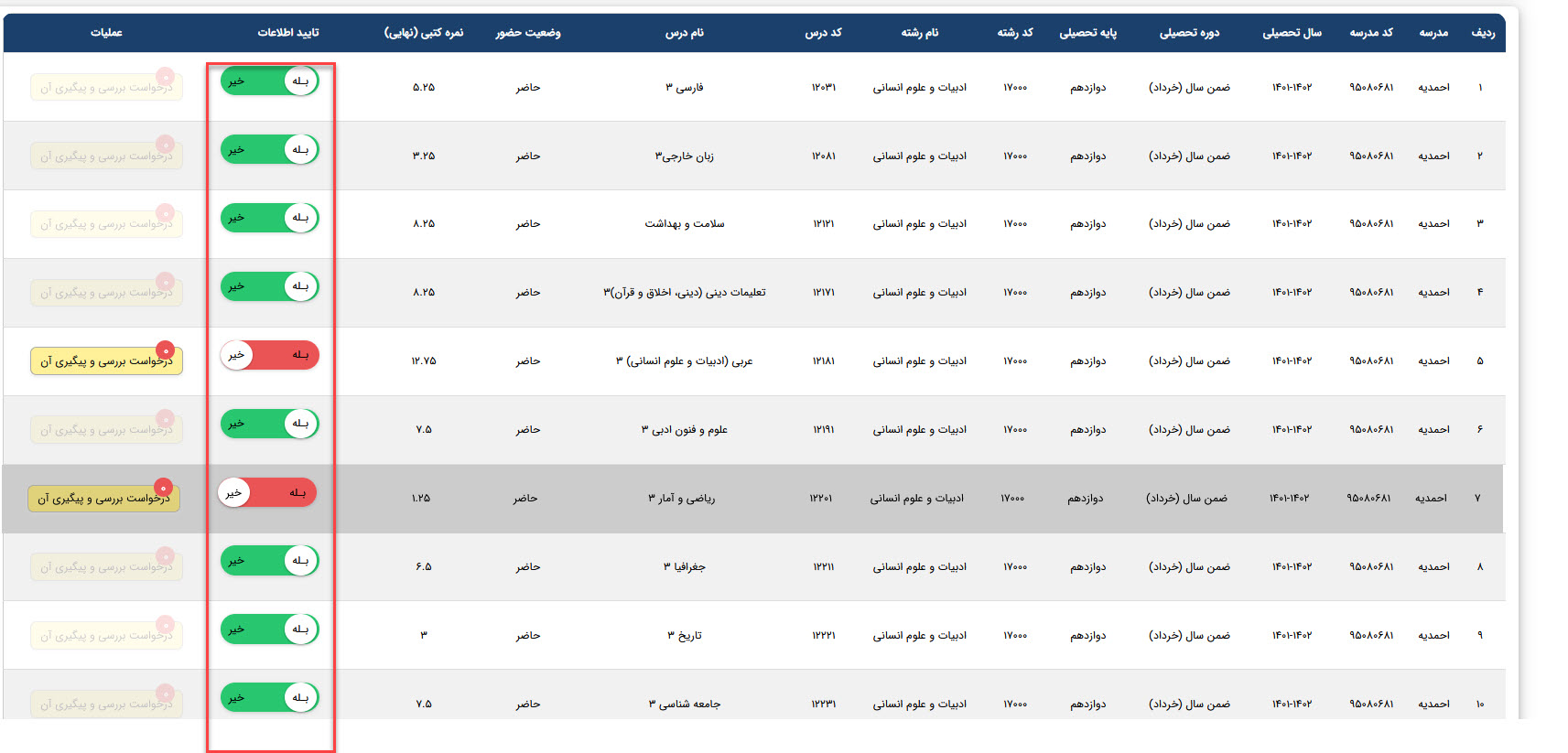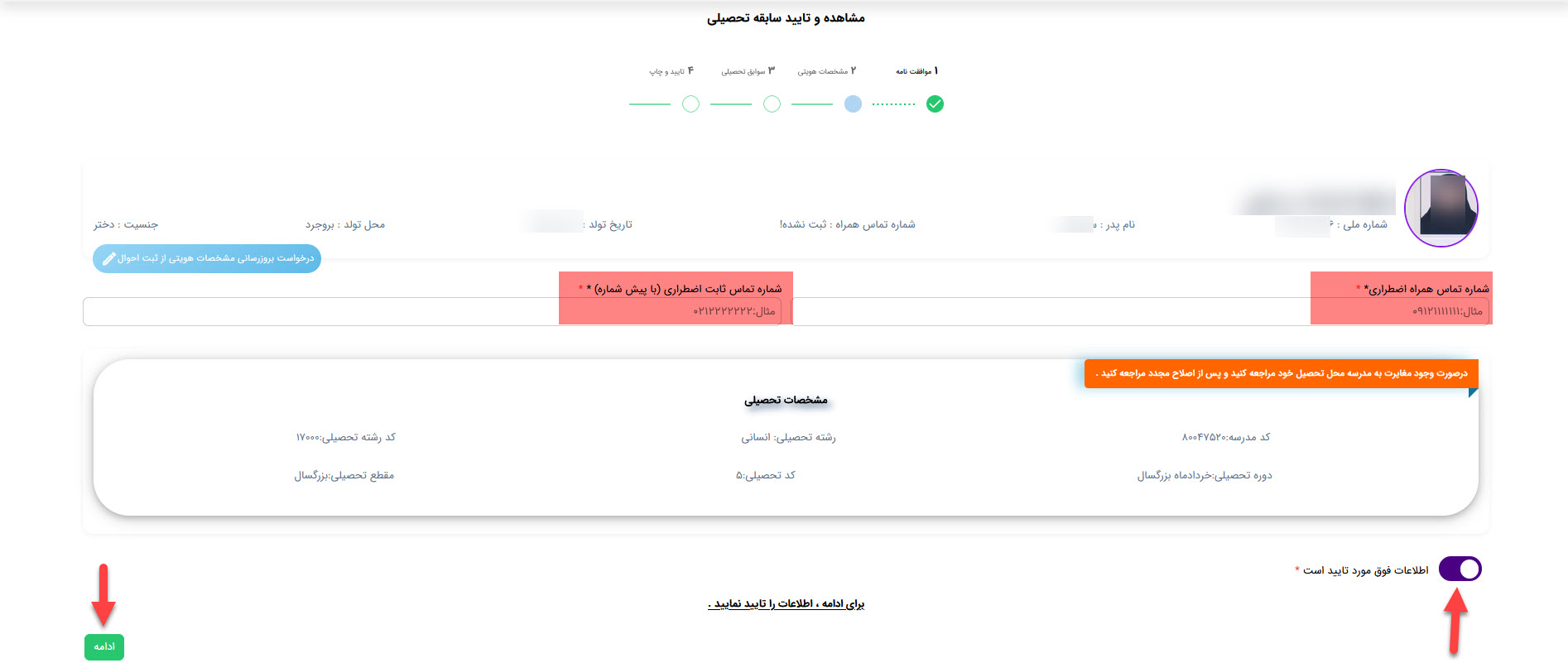 نهم: در مرحله بعد دانش آموز وارد بخش سوابق تحصیلی میشود. با مشاهده سوابق تحصیلی و نمرات موجود ابتدا در قسمت تایید اطلاعات، بر روی دکمه مربوط کلیک نموده تا همه موارد به حالت سبز یعنی بله قرار داده شوند و در نهایت تایید و ادامه را لمس میکند.
