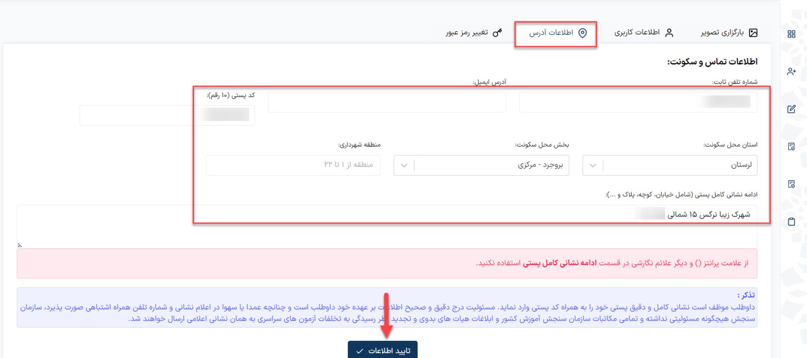 در بخش سوم اطلاعات مربوط به آدرس محل سکونت (اطلاعات آدرس) وجود دارد. این بخش را نیز همانند بخشهای دیگر تکمیل مینمایید.