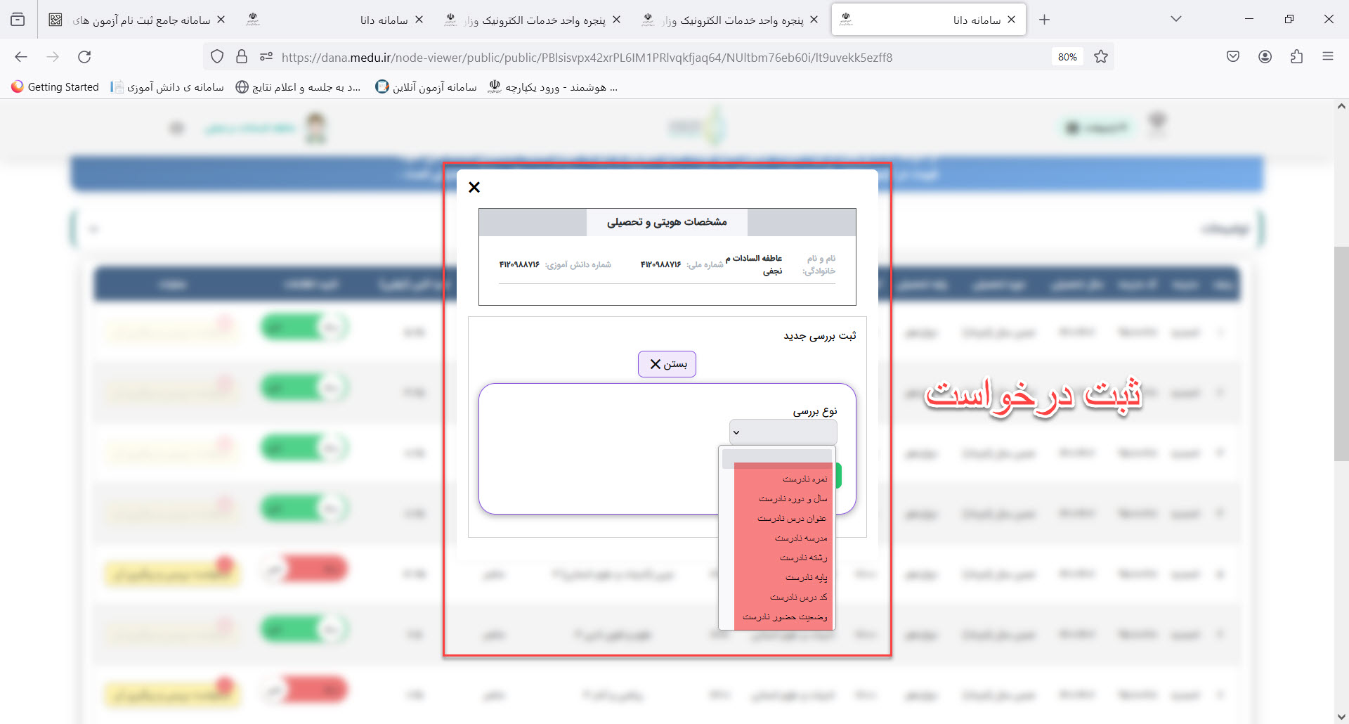 نکته: اگر نسبت به درسی چه از لحاظ وجود درس و یا نمره موجود اعتراضی وجود دارد ابتدا حالت تایید را بر روی خیر قرار داده و عنوان درخواست بررسی و پیگیری آن را لمس مینماید. سپس در بخش عملیات بر روی عنوان درخواست بررسی و پیگیری آن، کلیک می نماید. با انجام این کار شما با پیامی روبرو میشوید مبنی بر اینکه تا وضعیت درخواست مشخص نگردد امکان مراجعه به مراحل بعد وجود ندارد. بنابراین در ثبت درخواست دقت لازم را داشته و از ثبت درخواستهای غیر واقعی اجتناب نمایید. ابتدا این پنجره توضیحات را بسته و در پنجره باز شده جدید عنوان افزودن را لمس و یکی از عنوانهای مربوطه را انتخاب و بر روی بررسی کلیک نمایید.