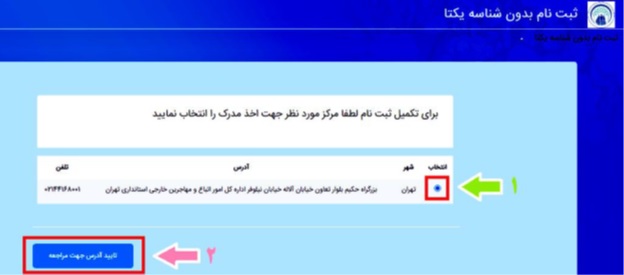 ۱۰. مرکزی که برای ارائه مدارک جهت دریافت کد یکتا معرفی شده را انتخاب نمائید و سپس روی گزینه تایید آدرس جهت مراجعه کلیک نمائید تا به مرحله بعد ارجا داده شوید.