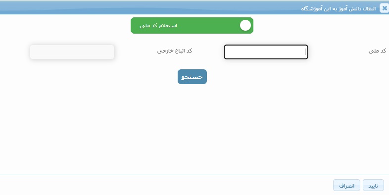 جهت جستجوی کد اتباع خارجی ابتدا بر روی دایره موجود در نوار سبز رن گ" استعلام کد ملی" کلیک کرده تا به استعلام کد اتباع خارجی تبدیل گردد .