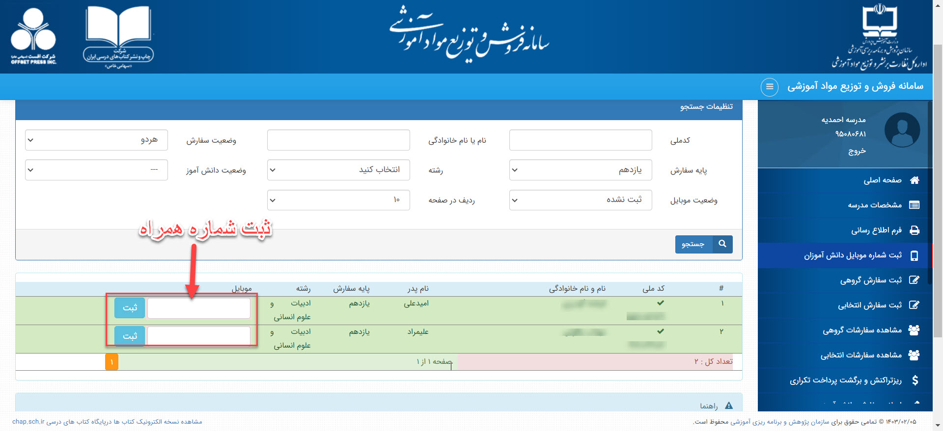 نکته: برای یافتن اسامی دانش آموزانی که فاقد شماره همراه میباشند ابتدا پایه سفارش سپس رشته و از قسمت وضعیت موبایل، عنوان ثبت نشده را انتخاب و عنوان جستجو را لمس مینماییم.