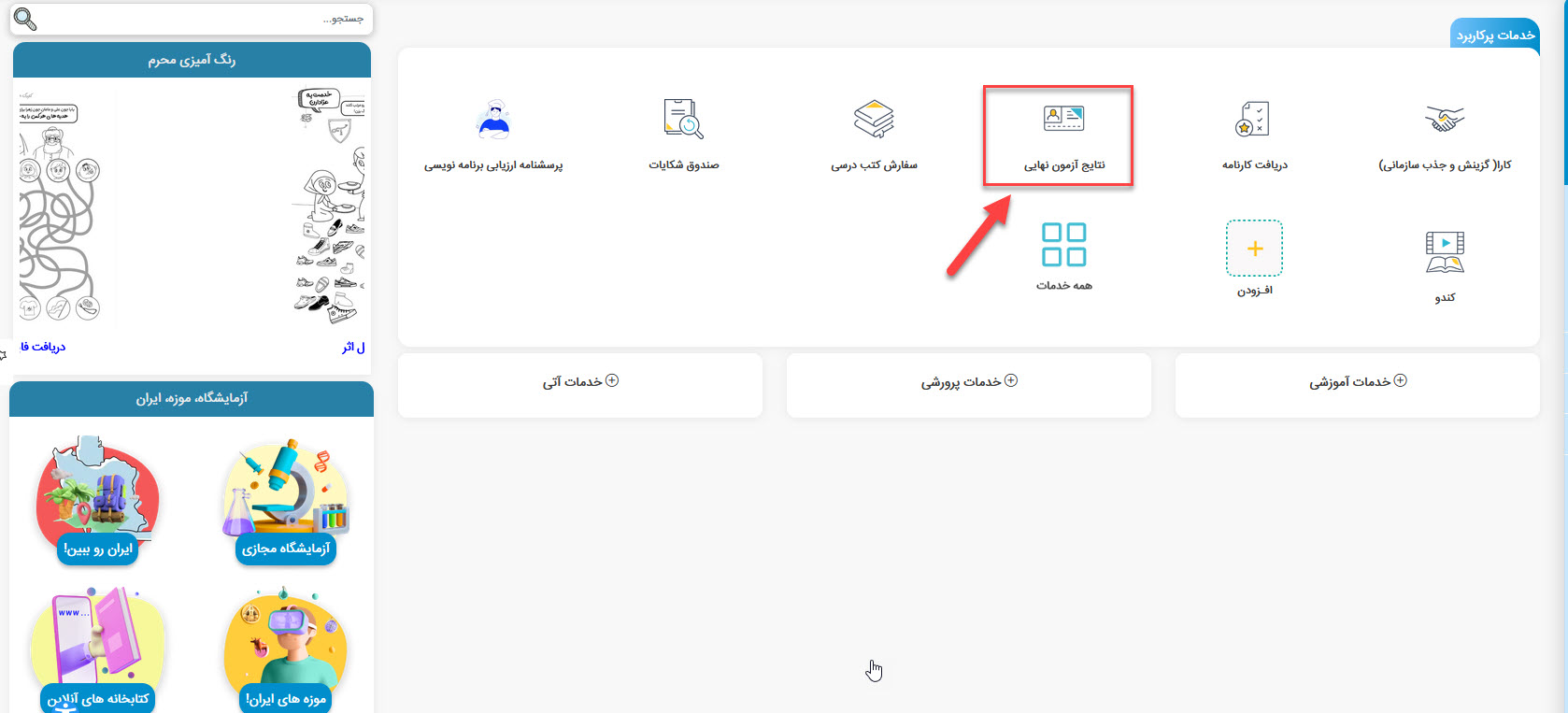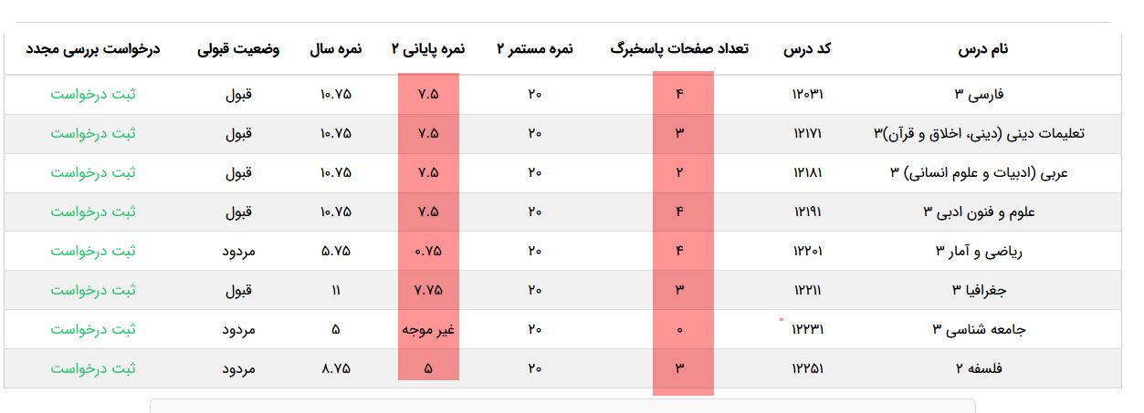 ۵. با توجه به نمرات ثبت شده در بخش نمره پایانی ۲ که مربوط به برگه امتحانات نهایی میباشد، چنانچه دانش آموز نسبت به نمره کسب شده خود اعتراض دارد میتواند اعتراض خود را از طریق ثبت درخواست انجام دهد. ۶. در کارنامه ستونی تحت عنوان تعداد صفحات پاسخ برگ نیز وجود دارد که تعداد اوراق بارگذاری شده مربوط به هر امتحان را نشان میدهد چنانچه دانش آموز مطمئن است که تعداد اوراق بارگذاری شده کم میباشد میتواند نسبت به این مورد نیز ثبت درخواست نماید.