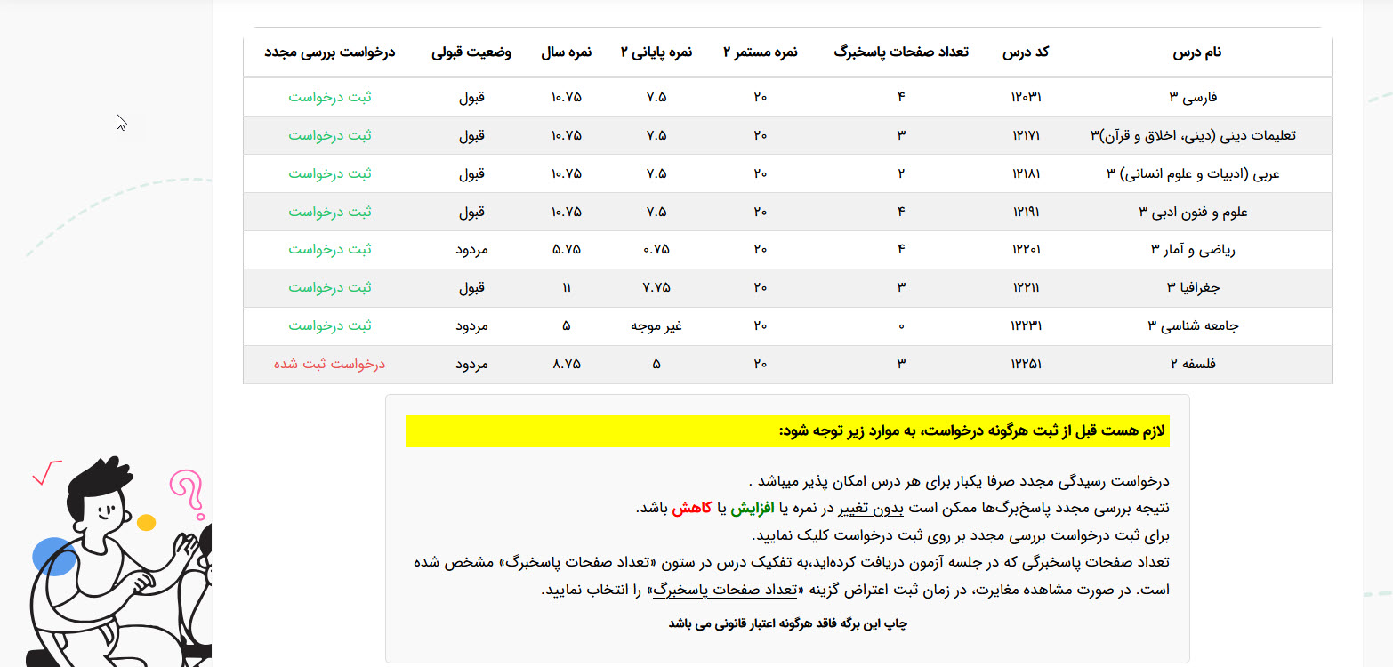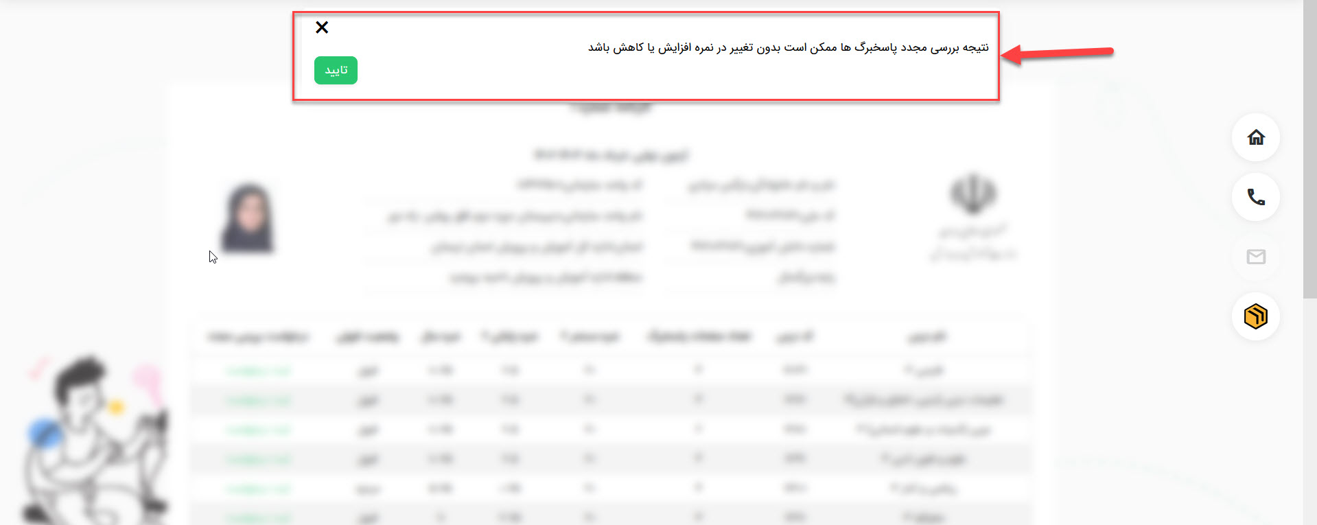 ۲. در صفحه جدید پیامی مبنی بر نتیجه بررسی نمایان میشود که به دانش آموزان گوش زد میکند مبنی بر اینکه ثبت اعتراض میتواند نتایج متفاوتی داشته باشد.