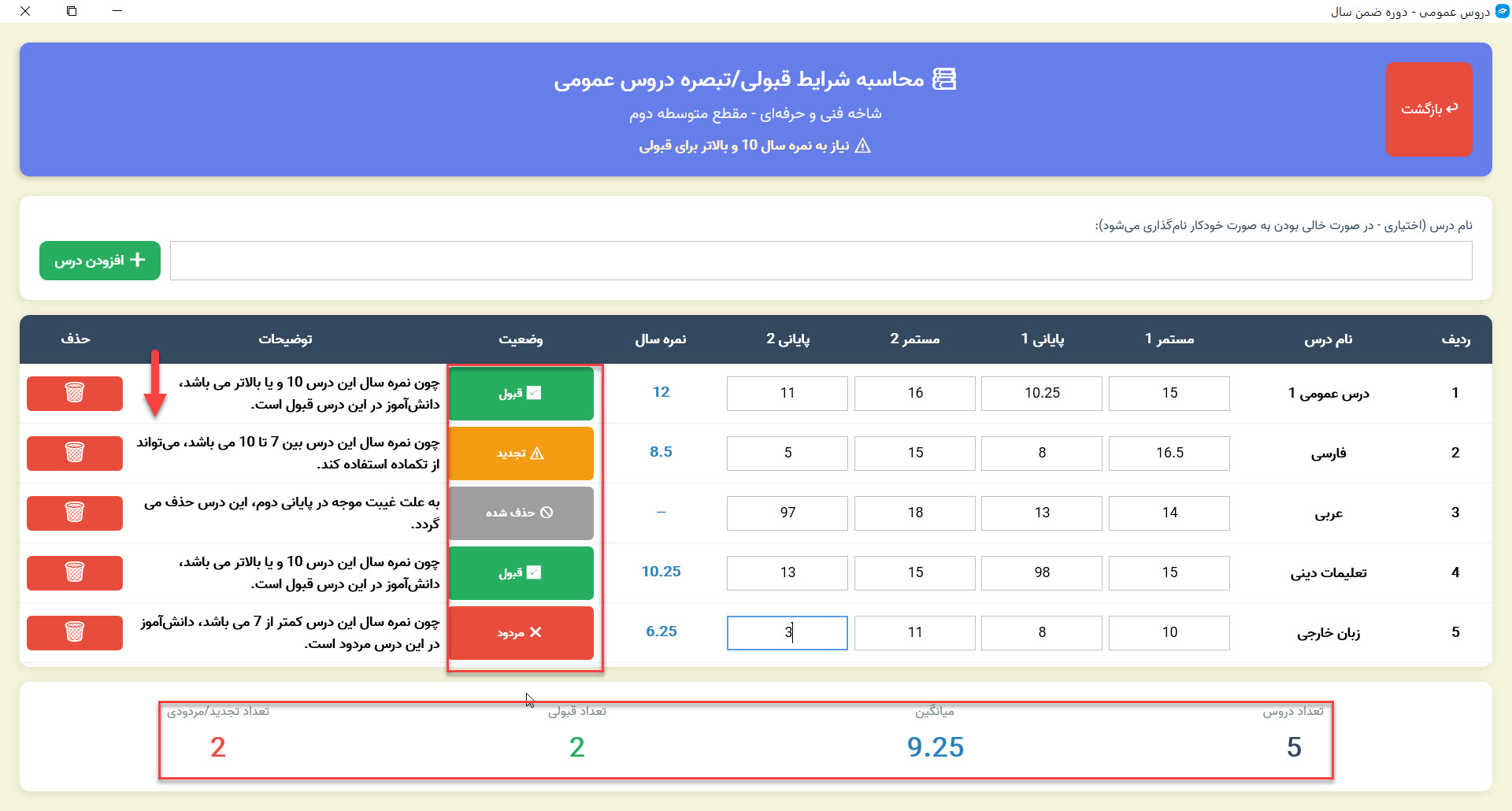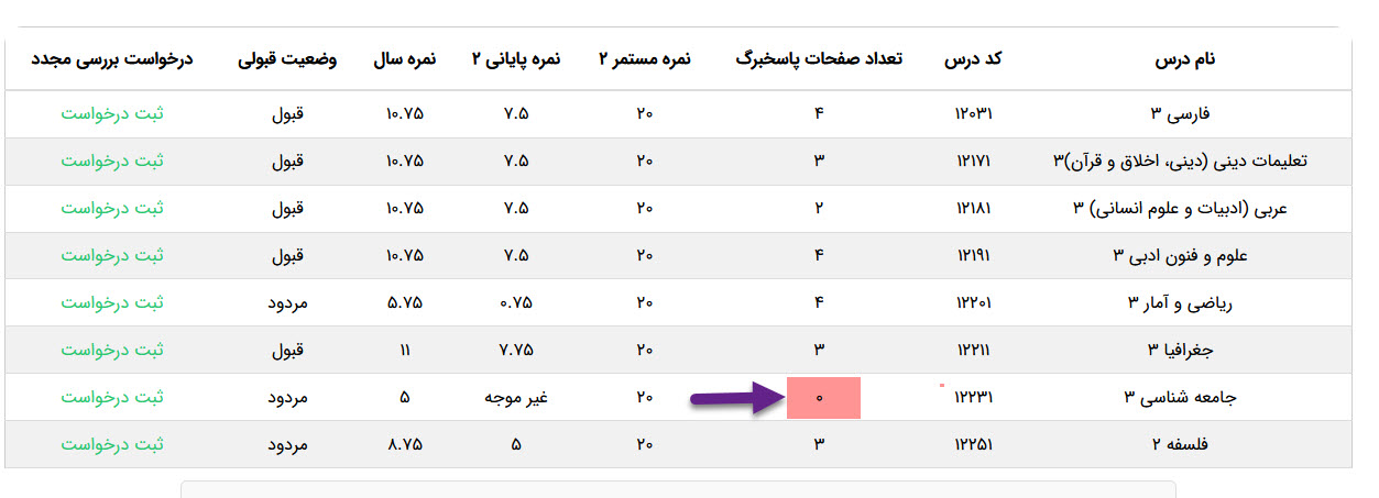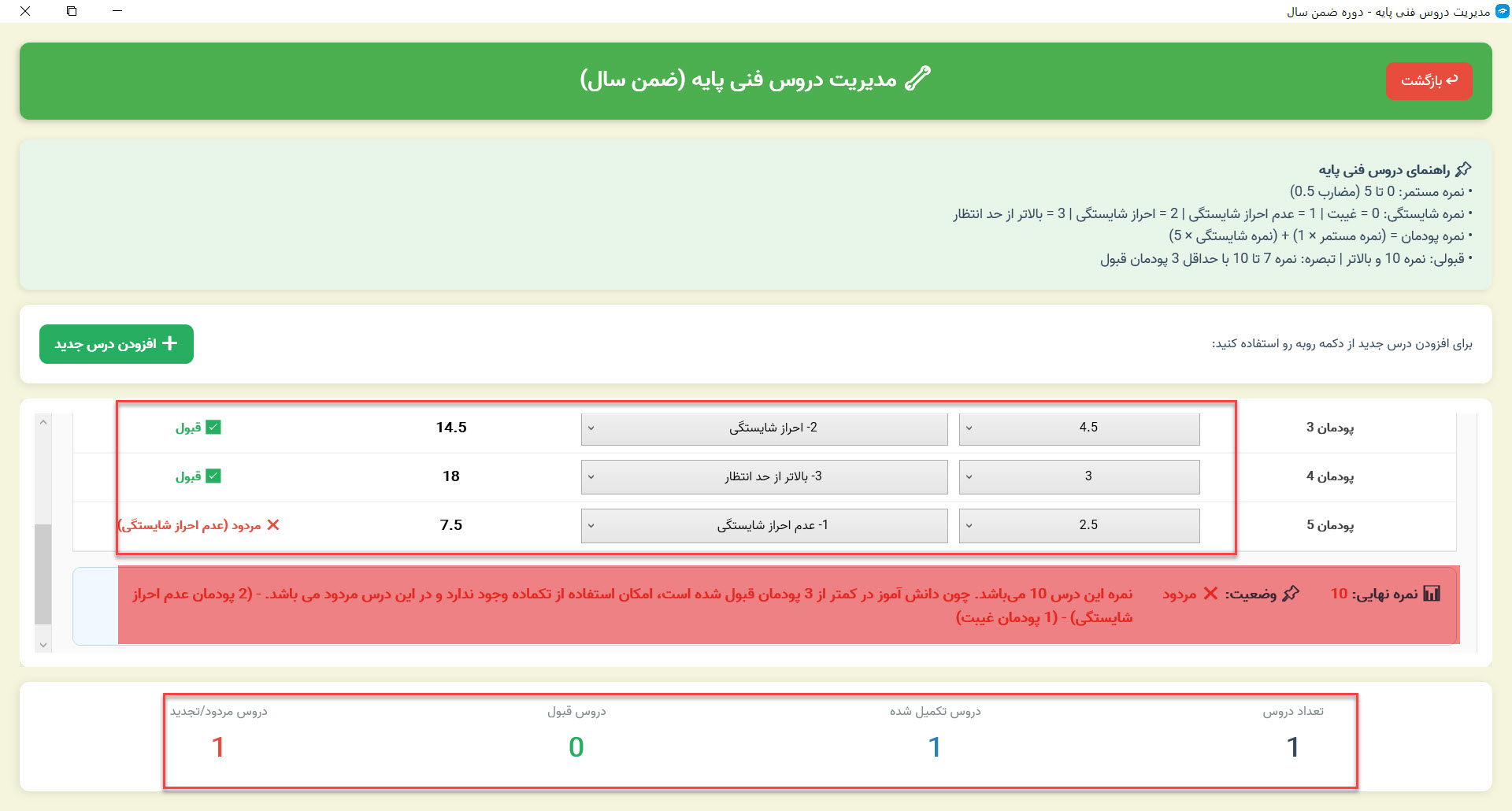 در تصویر فوق نمره نهایی ۱۰ وضعیت مردود و توضیحات مربوطه نیز بیان شده است که میتوان دلیل مردودی و عدم تک ماده را نیز متوجه شد.