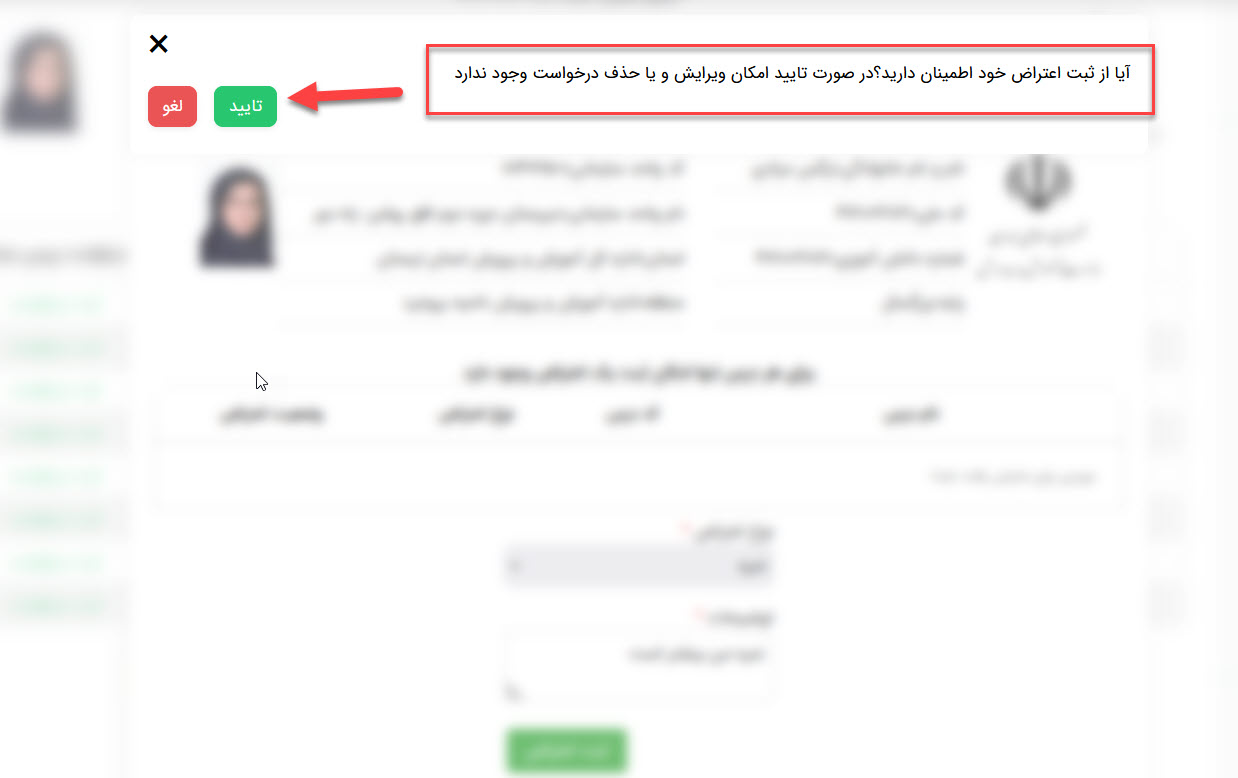 و در ادامه عنوان ثبت اعتراض را لمس میکند. ۹. در پیام داده شده اگر از ثبت اعتراض اطمینان دارد عنوان تایید را لمس مینماید.