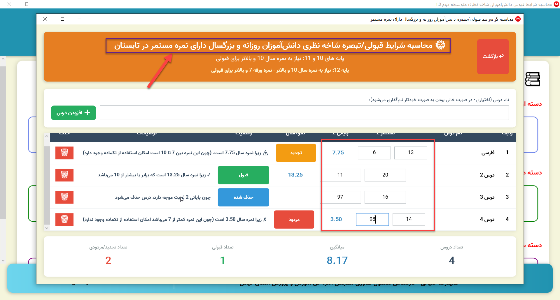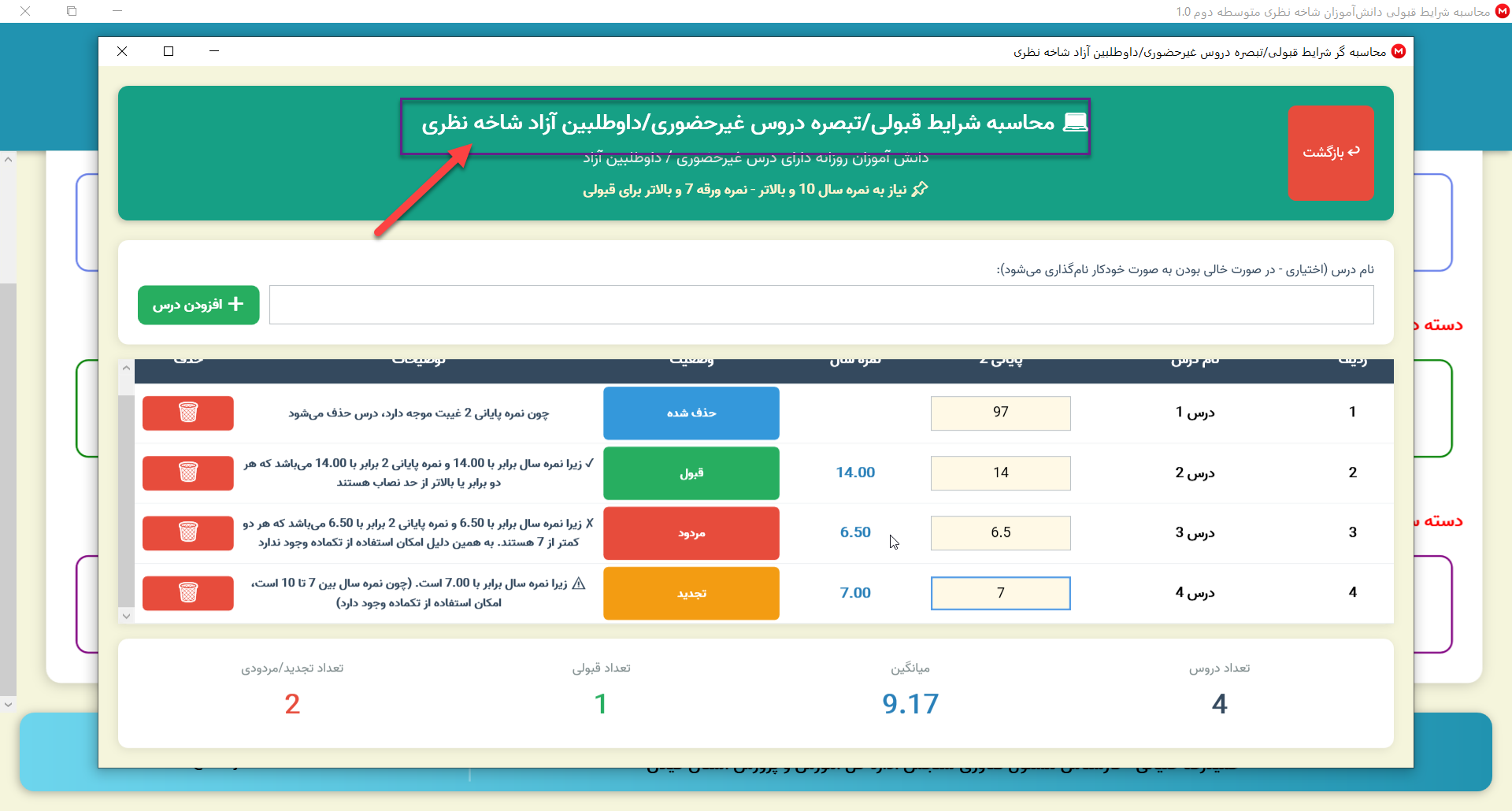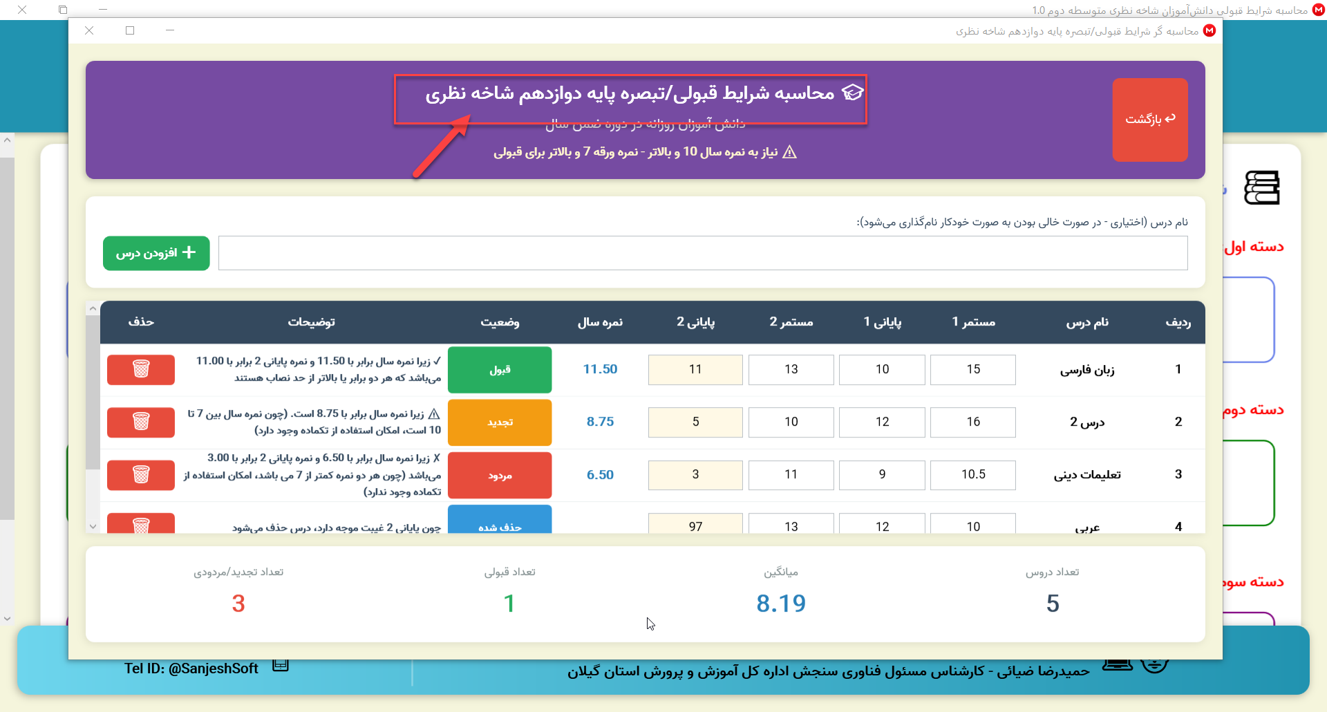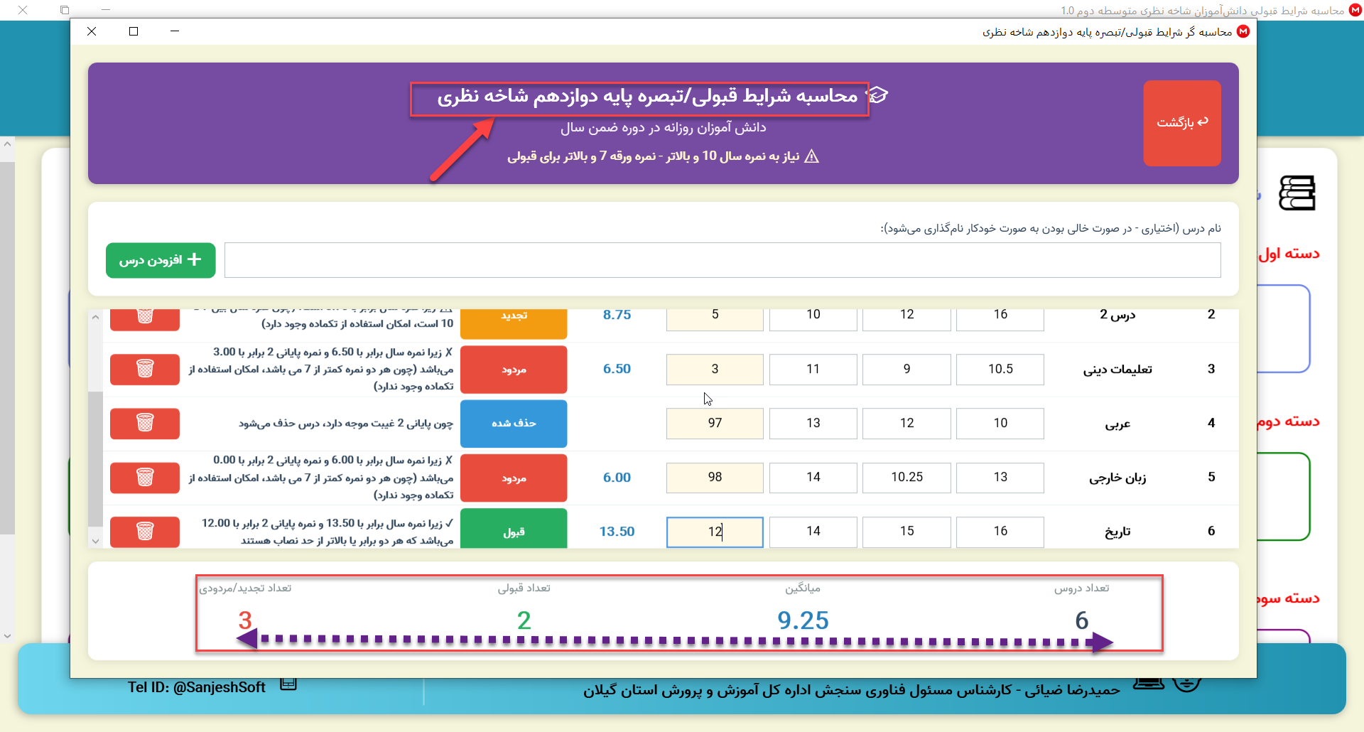 نرمافزار محاسبه شرایط قبولی دانش آموزان متوسطه دوم شاخه نظری نرمافزار محاسبه شرایط قبولی/تکماده دانشآموزان شاخه نظری: نرمافزاری کاربردی و دقیق برای محاسبه سریع وضعیت قبولی، مردودی و شرایط تکماده دانشآموزان شاخه نظری متوسطه دوم بر اساس آخرین بخشنامهها و دستورالعملهای آموزش و پرورش می باشد که با رابط کاربری ساده و زیبا، نیاز دبیران و مدارس را برای محاسبه وضعیت تحصیلی دانش آموزان برطرف میکند. ✨ ویژگیهای کلیدی: تاریخ انتشار برنامه: 1404/07/27 ======= ابتدا برنامه را دریافت کرده و از حالت زیپ خارج کنید سپس برنامه را اجرا نمایید.
