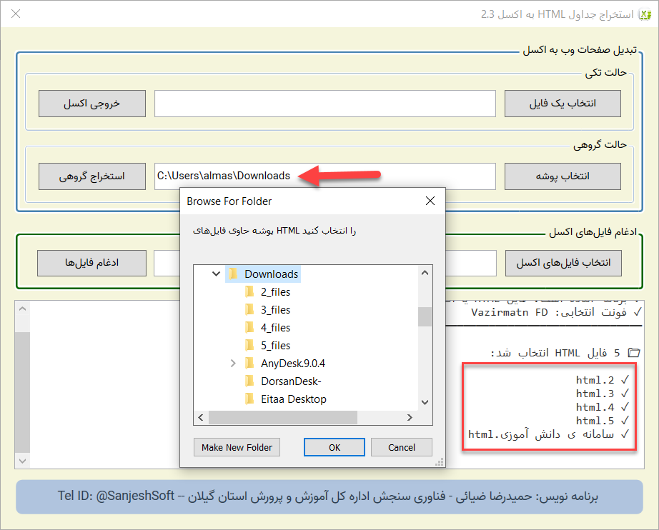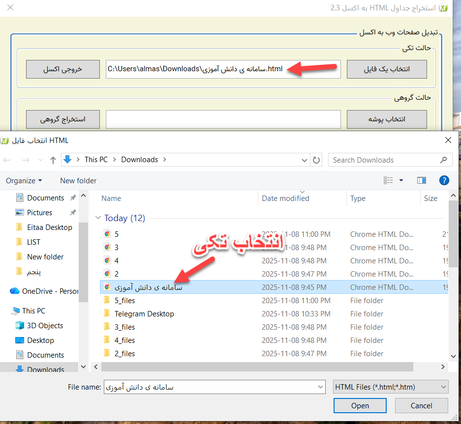 به این صورت در زمان دریافت اطلاعات میتوانید همه فایلها را به صورت یکجا دریافت کنید. در زمان ذخیرهسازی دقت داشته باشید که تا تکمیل ذخیره سازی صفحه مربوطه را تغییر ندهید. بعد از تکمیل صفحه بعدی را انتخاب کنید. ۶. بعد از تکمیل فرایند ذخیره سازی اطلاعات برنامه html به اکسل را اجرا نمایید. ۷. ورود به برنامه میتوانید ببینید که این برنامه شامل سه قسمت میباشد اول_ حالت تکی دوم_ حالت گروهی سوم_ ادغام فایلهای اکسل.