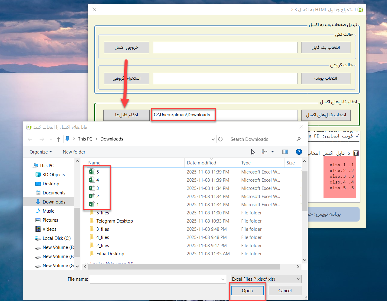 همان گونه که در تصویر فوق قابل مشاهده است کلیه فایلهایی که به صورت html ذخیره شدهاند در برنامه دریافت شده و منتظر استخراج اطلاعات است. پس از لمس عنوان خروجی اکسل و یا استخراج گروهی اطلاعات به صورت اکسل ذخیره خواهند شد. بخش سوم: ادغام فایلهای اکسل برای ترکیب نمودن فایلهای اکسلی هست که از صفحات مختلف تهیه کردهاید.