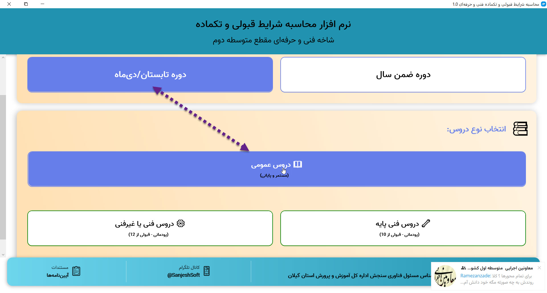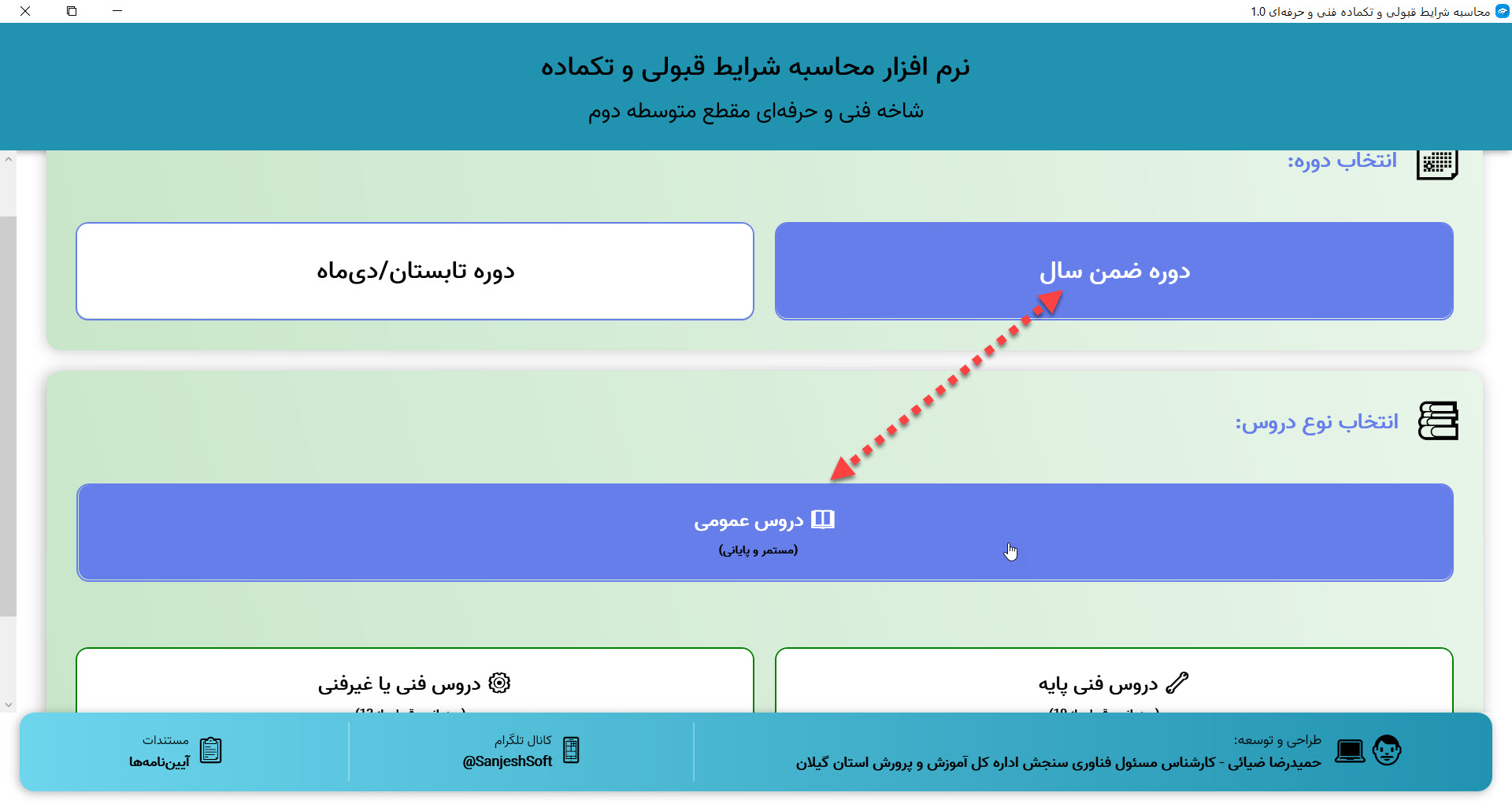 نرمافزار محاسبه شرایط قبولی و تک ماده شاخه فنی و حرفهای 🎓 نرمافزار محاسبه شرایط قبولی/تبصره شاخه فنی و حرفهای 1.0 این نرمافزار تخصصی برای معلمان، مسئولین آموزشی و دانشآموزان شاخه فنی و حرفهای طراحی شده است. ✅ ویژگیهای کلیدی: ✔️ محاسبه دقیق شرایط قبولی/تبصره دروس عمومی (مستمر و پایانی) برای دریافت برنامه عنوان زیر را لمس نمایید. نرمافزار محاسبه شرايط قبولی و تک ماده شاخه فنی و حرفهای روش استفاده از نرم افزار: ➖ پس از دریافت برنامه آن را از حالت فشرده خارج نمایید.