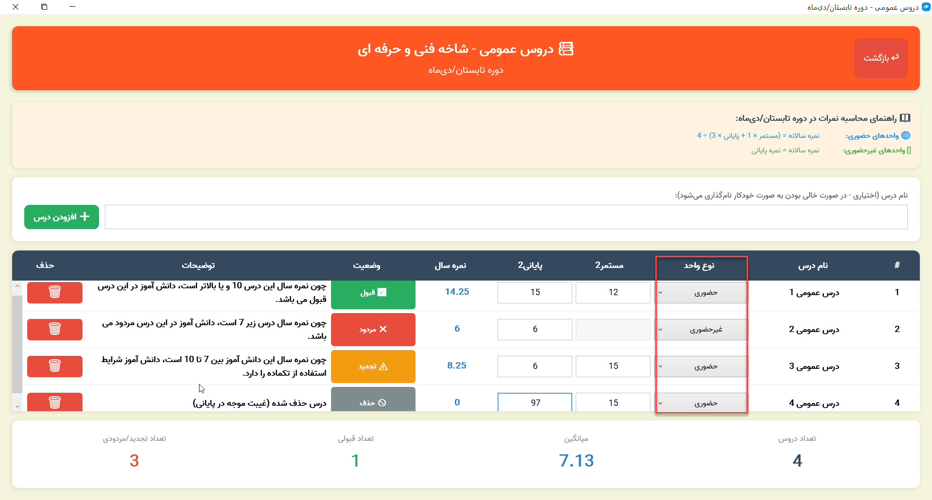 ➖ با انتخاب دوره تابستان / دی ماه قسمت نوع واحد باید حضوری و یا غیر حضوری برای هر پودمان مشخص شده و پس از ثبت مستمر نمره شایستگی انتخاب گردد.
