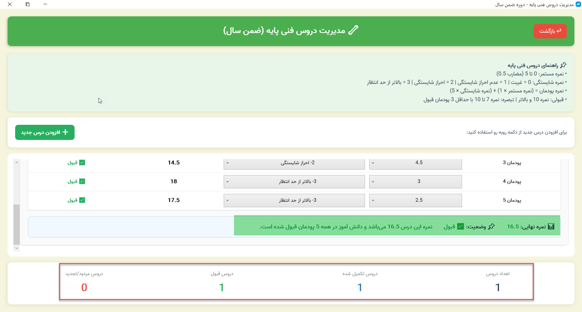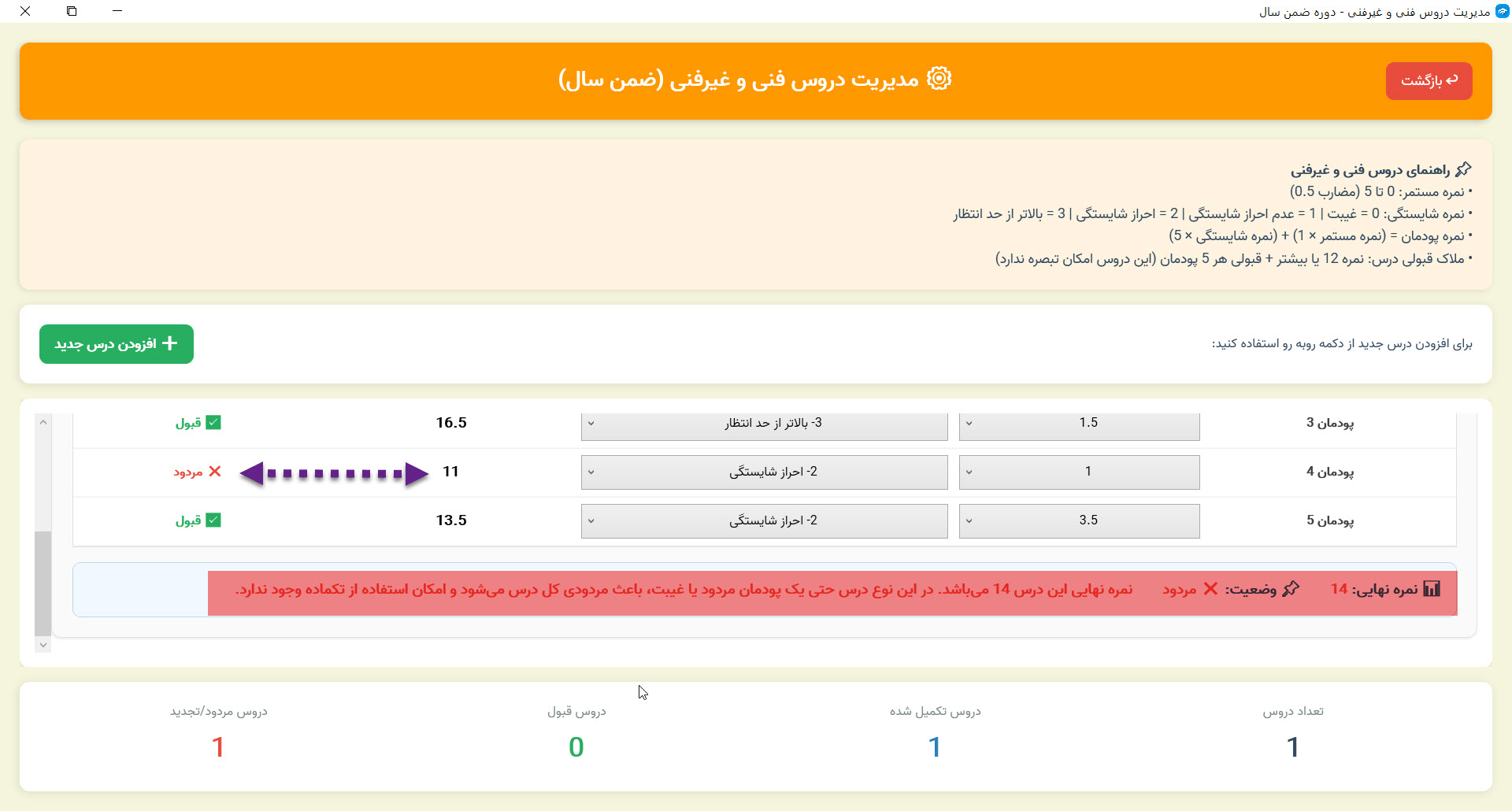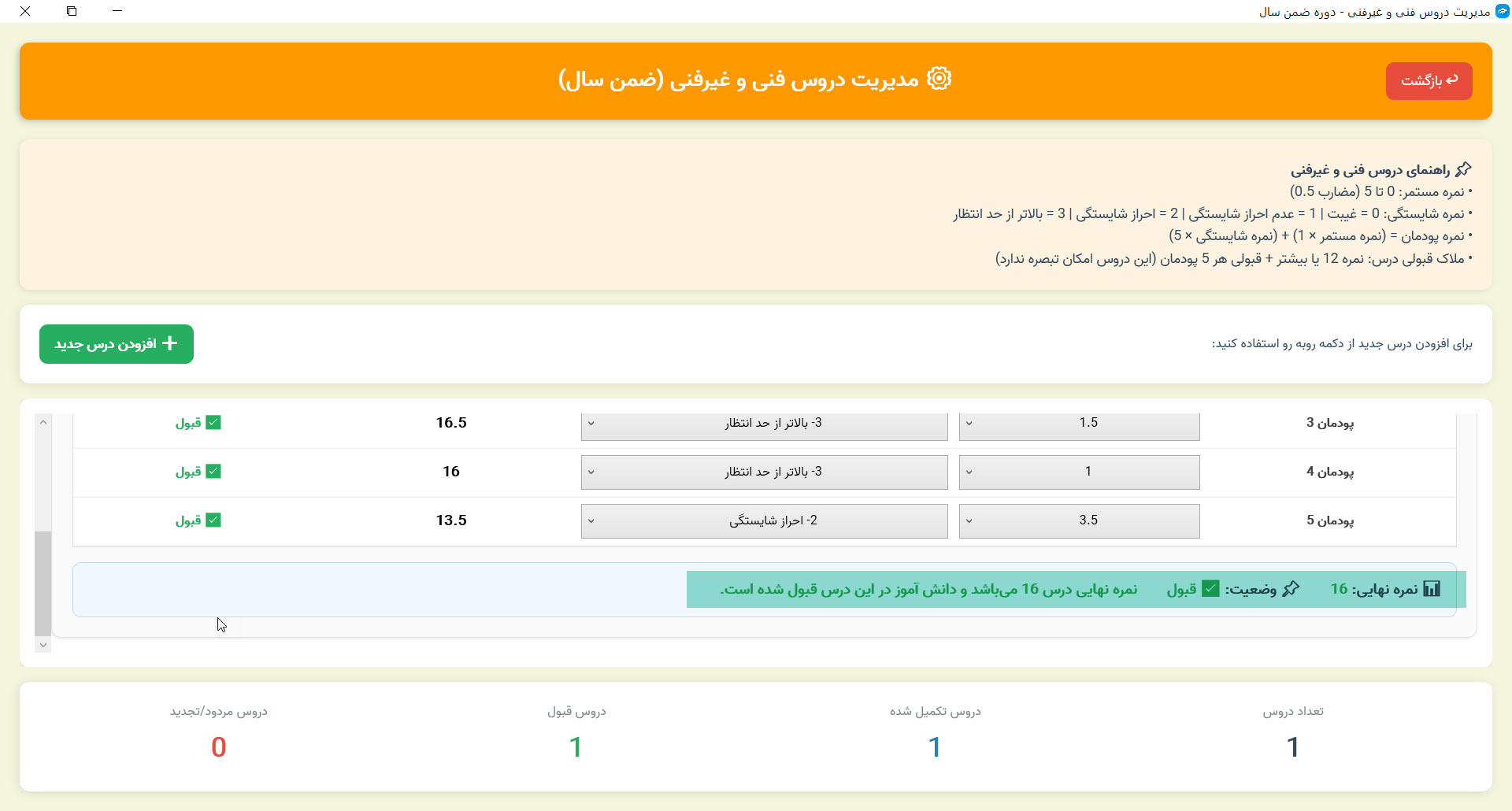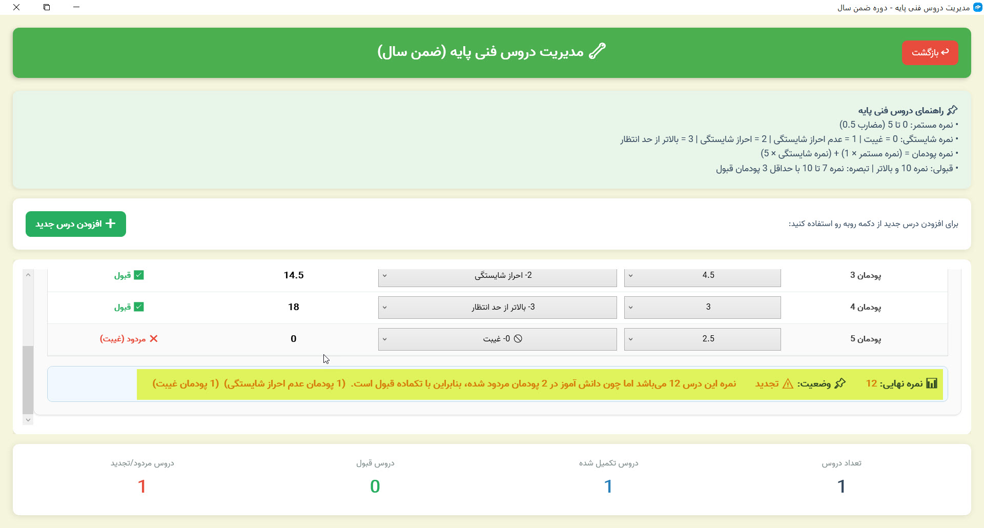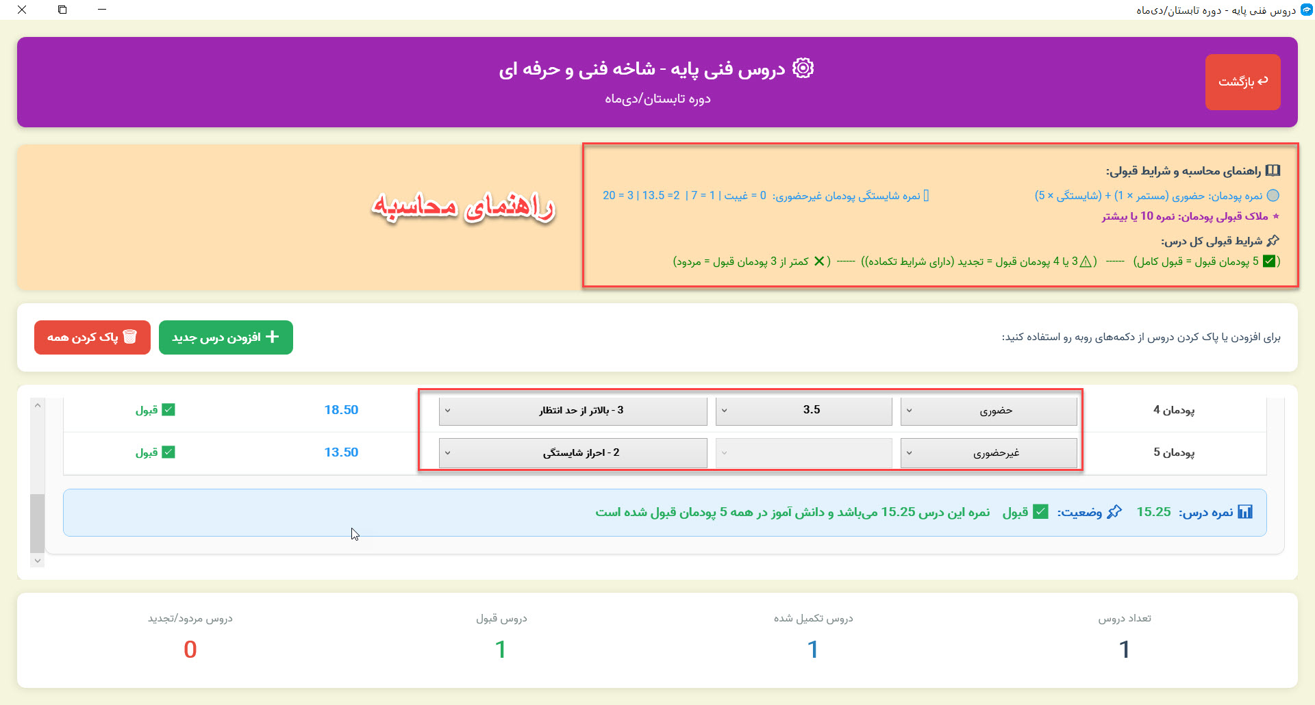 راهنمای محاسبه و شرایط قبولی در بالای صفحه بیان گردیده هست. ➖ با توجه به اینکه در دروس فنی شرط قبولی گرفتن حداقل نمره ۱۲ در کلیه پودمانها میباشد و همچنین این دروس امکان تک ماده را ندارند بنابراین اگر دانش آموز حتی در یک پودمان نمره قبولی ۱۲ کسب ننماید گرچه نمره نهایی بالاتر از ۱۲ باشد، اما در آن درس قبول نمیباشد.