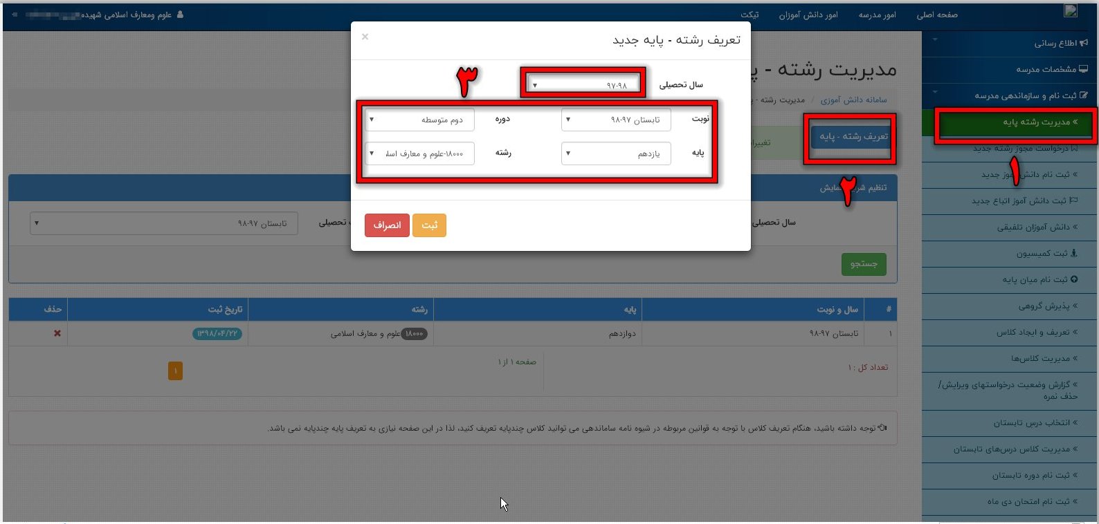 1- از بخش ثبت نام و سازماندهی مدرسه مدیریت رشته و پایه را انتخاب و کلیه رشته ها و پایه هایی را که برای دوره تابستان نیاز است تعریف نمایید. (ممکن است بعضی از رشته ها دانش آموز افتاده نداشته باشد پس لزومی به تعریف کردن وجود ندارد)