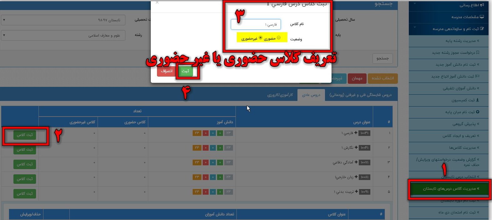 نکته2: در تابستان ضرورتی ندارد مانند ضمن سال (مثلا اگر در ضمن سال 3 کلاس انسانی داشته اید) به تعداد کلاس های هر رشته کلاس تعریف شود. به عبارت دیگر برای هر درس فقط 1 کلاس حضوری و 1 کلاس غیر حضوری کفایت می کند.