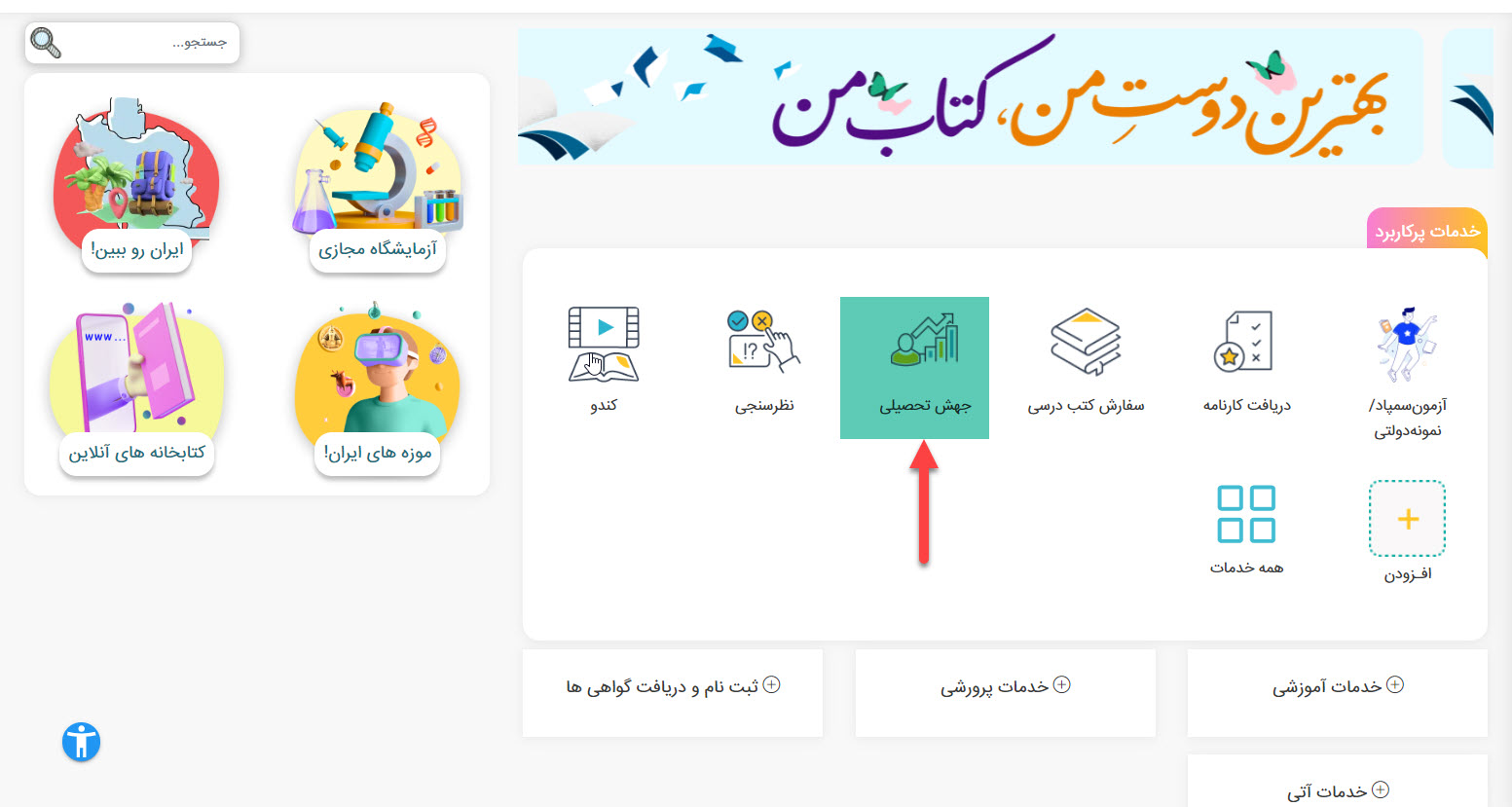 🔺️ پس از ورود به سامانه مای عنوان جهش تحصیلی را لمس نموده تا به صفحه جدید ارجاع داده شود.