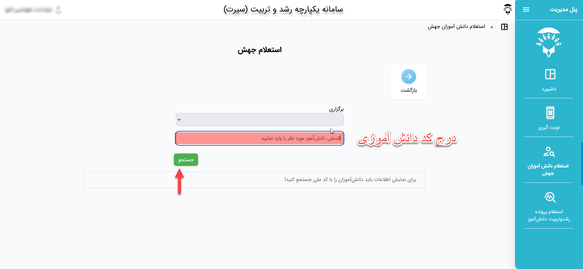 ➖ با ورود به مرحله بعد کد ملی دانش آموز مورد نظر را وارد و سپس عنوان جستجو را کلیک مینماید.