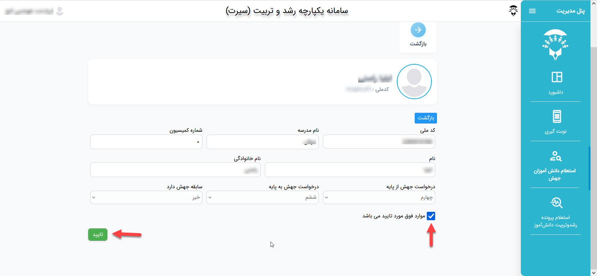 ➖ با مشاهده اطلاعات دانش آموز و اطمینان از صحت اطلاعات تیک þ عنوان موارد فوق مورد تایید میباشد را فعال و تایید مینماید.