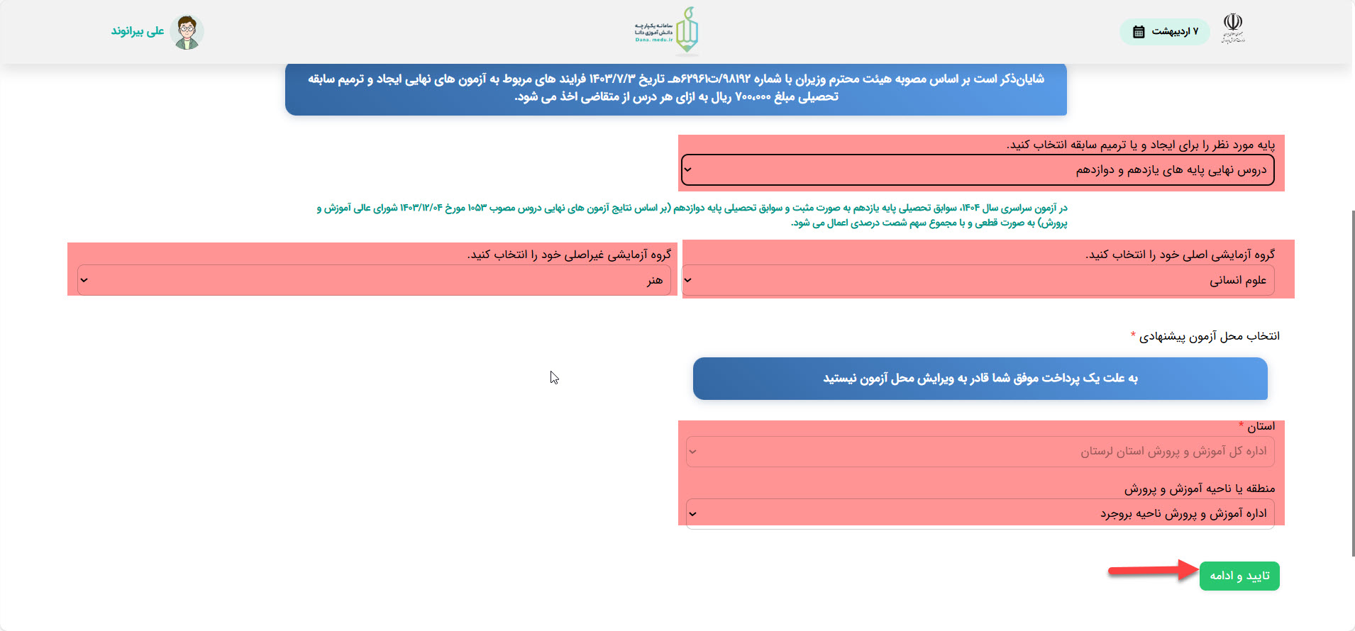 ➖ در این صفحه با مشاهده اطلاعات شخصی موارد خواسته شده در پایین صفحه یعنی -پایه -گروه آزمایشی اصلی -گروه آزمایشی غیر اصلی (در صورتی که متقاضی این بخش هستید) را انتخاب نمایید و در نهایت عنوان تایید و ادامه را لمس کنید.